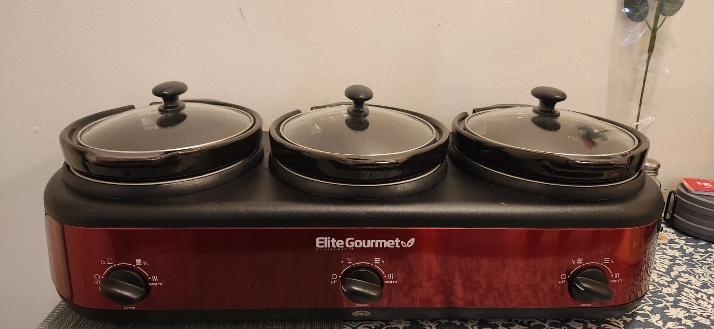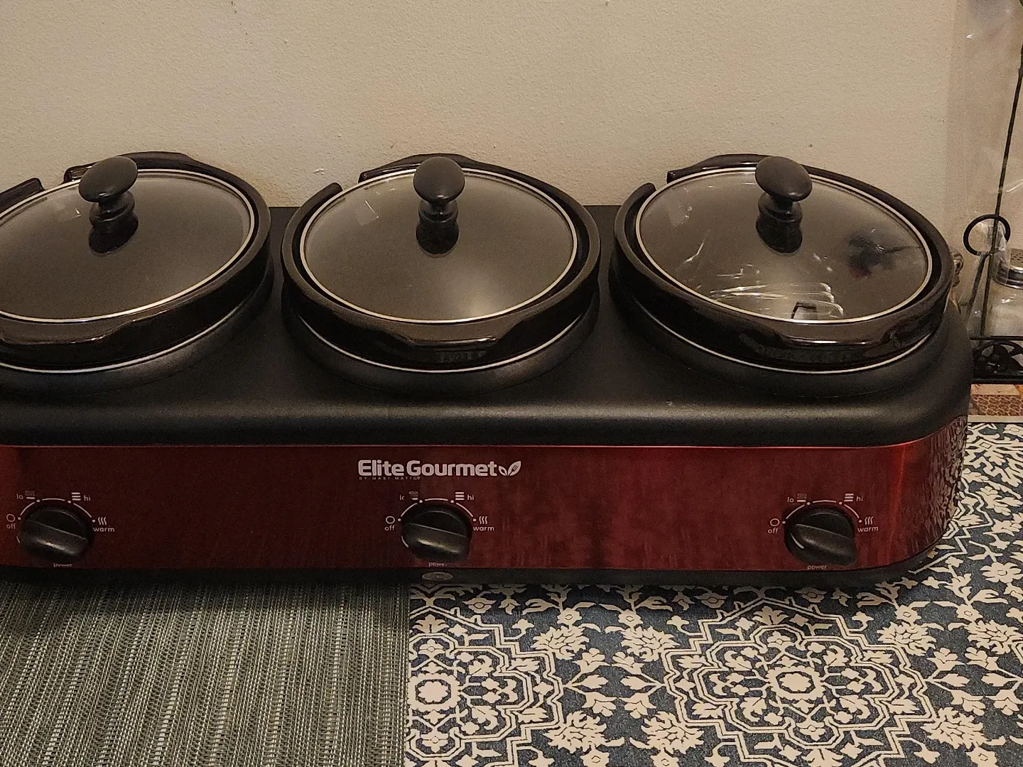 Selling an Elite Gourmet triple slow cooker. It's perfect for parties or keeping multiple dishes warm at the same time. The unit features three separate crock pots, each with its own temperature control. Great for dips, appetizers, or side dishes