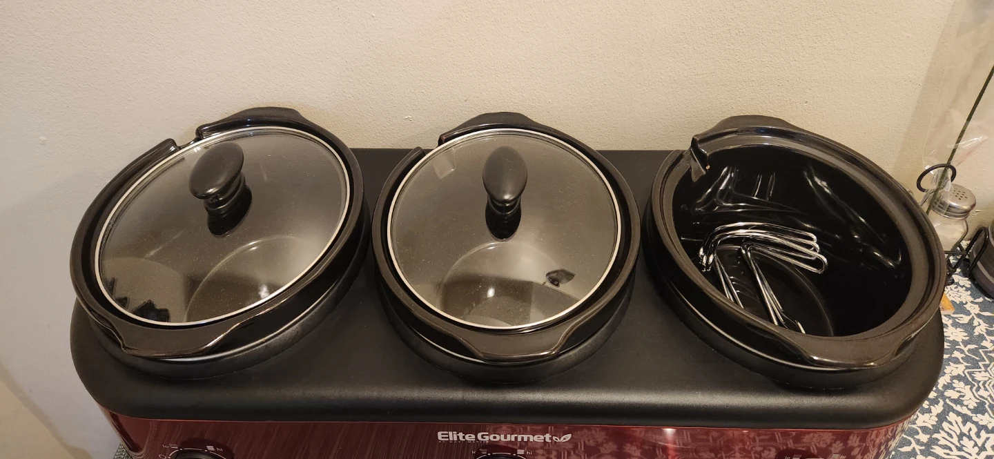 Selling an Elite Gourmet triple slow cooker. It's perfect for parties or keeping multiple dishes warm at the same time. The unit features three separate crock pots, each with its own temperature control. Great for dips, appetizers, or side dishes