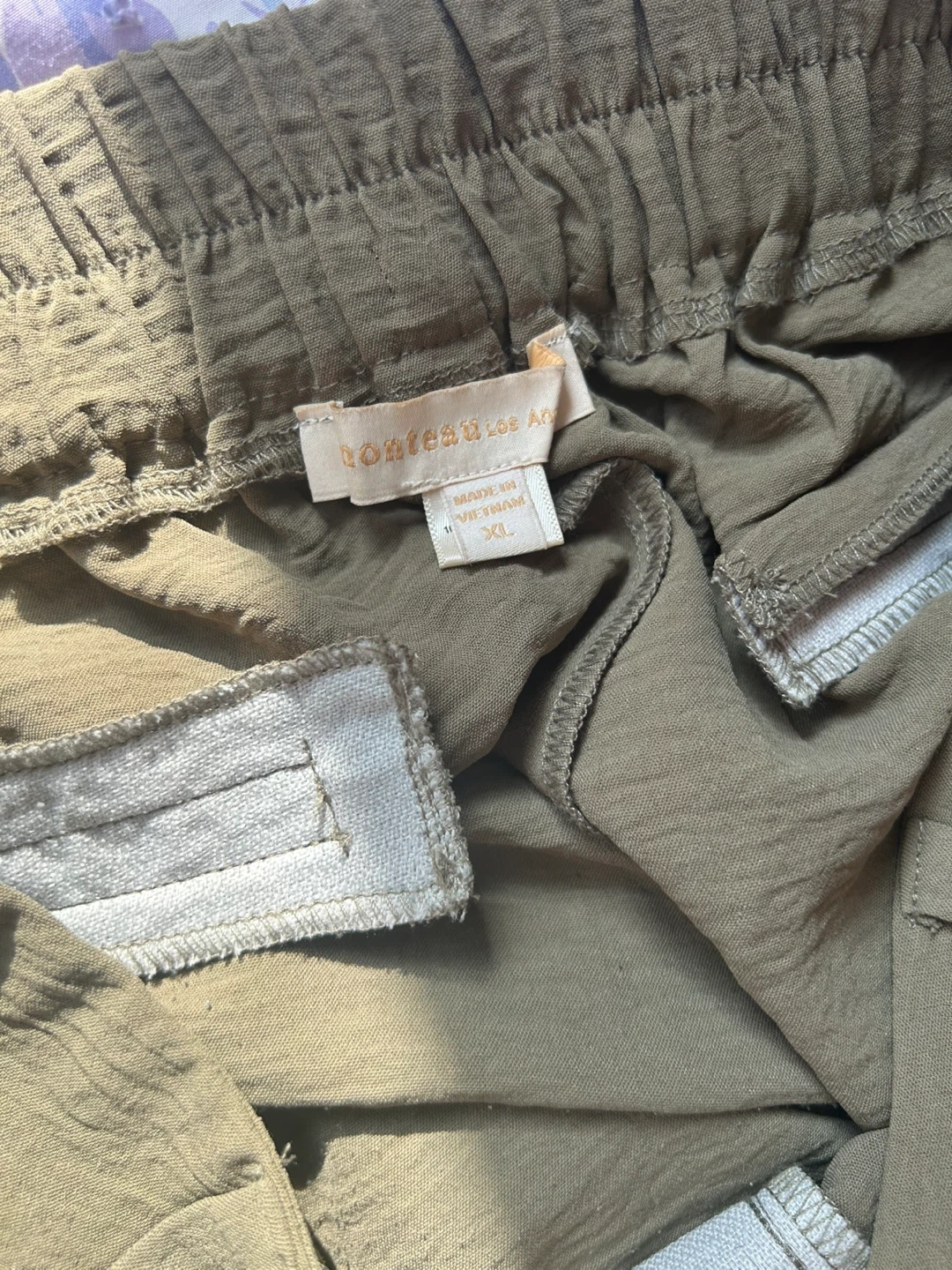 These are a pair of Monteau Los Angeles cargo pants in size XL. They have a textured appearance and a neutral colour, perfect for a casual and comfortable fit. Olive green colour.