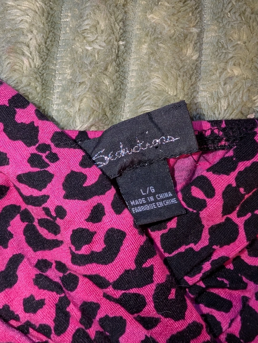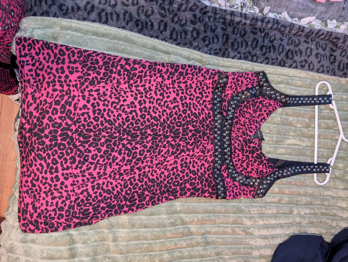 Cute pink dress with a fun leopard print! It has studded detailing around the neckline and waist. Size Large is listed on the tag, though I'm a medium and it fits me just fine! Stretchy soft material.