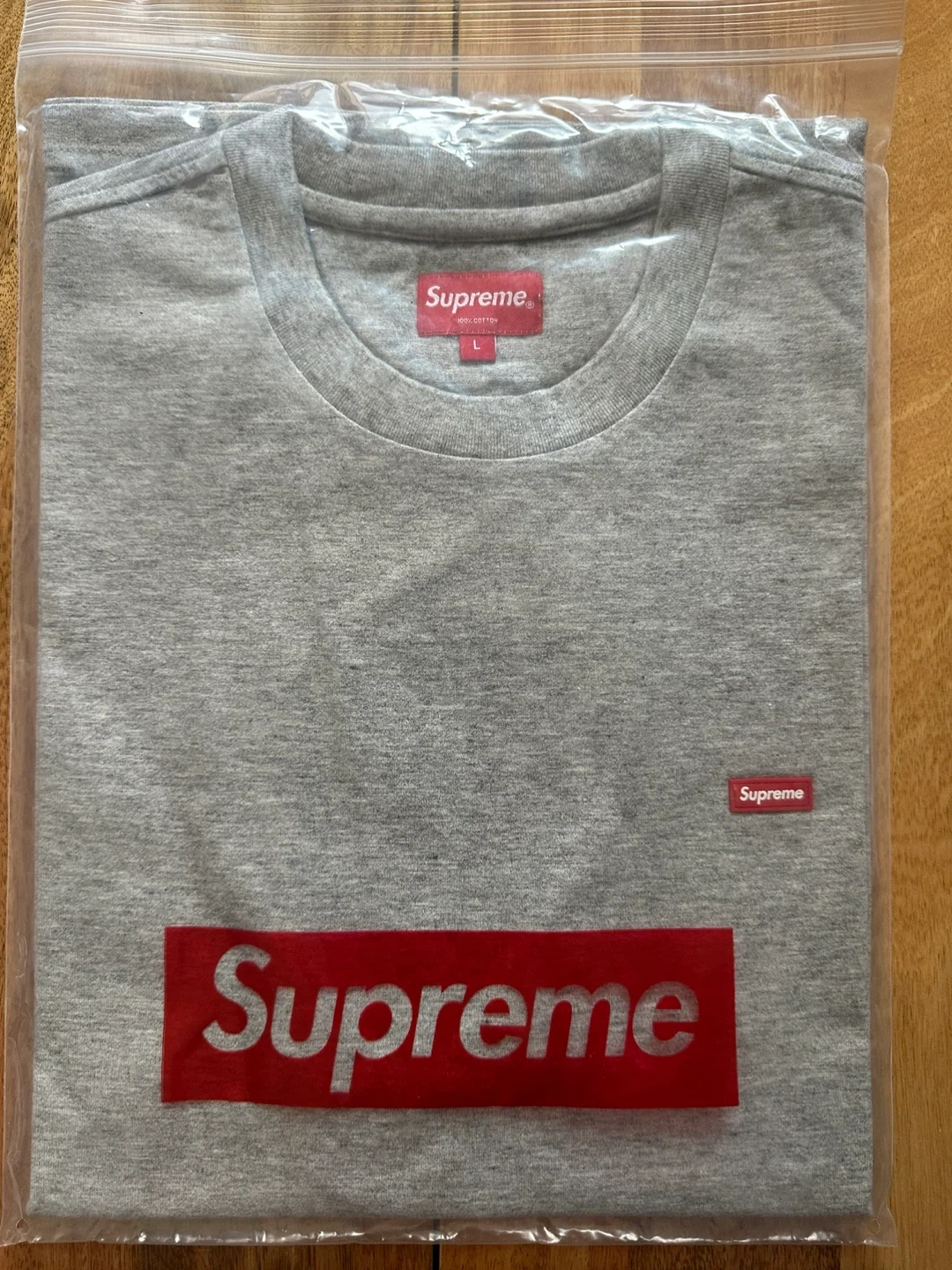 I'm selling a brand new Supreme Small Box Tee t-shirt, still in its original packaging! It's gray with the classic Supreme logo in red. Size is Large.