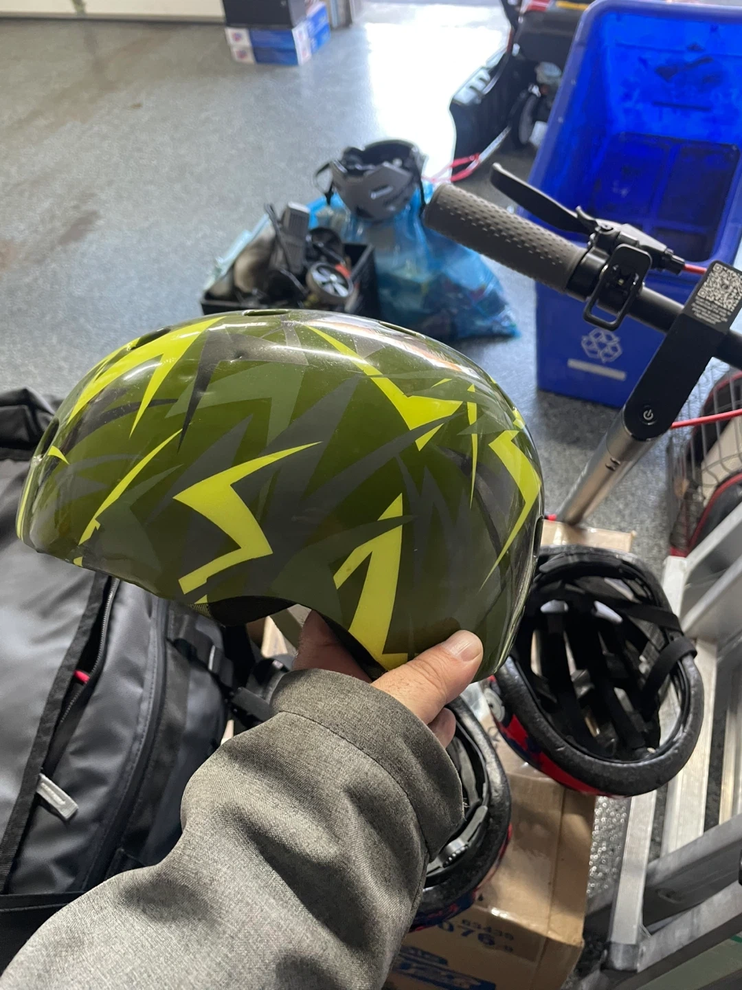 Selling a couple of kids' bike helmets. One is blue with a motorcycle design, and the other is green with a geometric pattern. Perfect for keeping your little ones safe while they ride! $10 each or all 3 for $25
