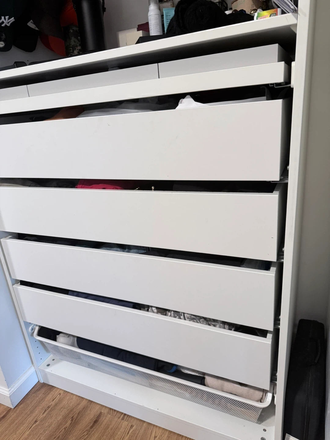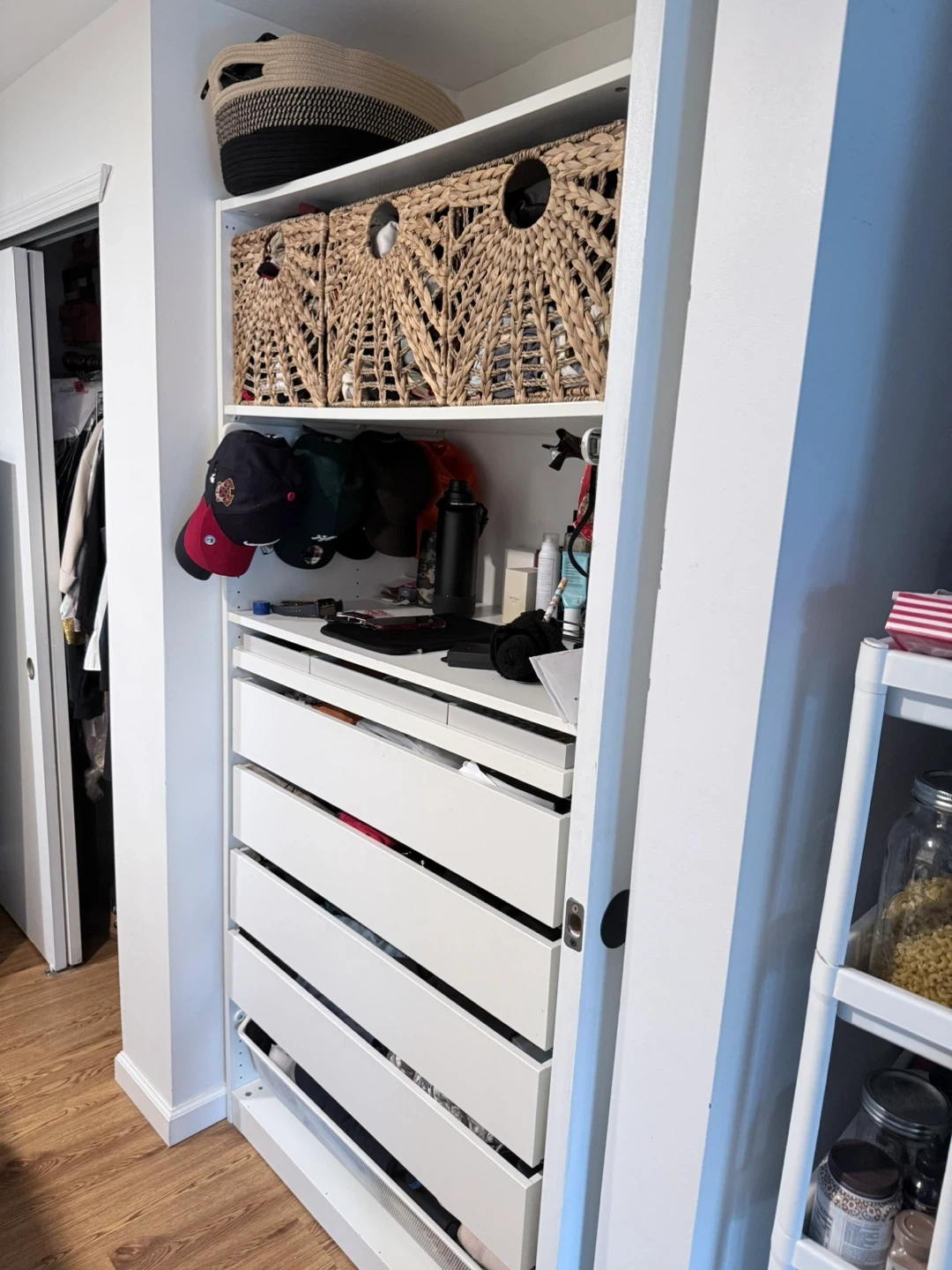 Selling an IKEA PAX wardrobe frame in white. It has several drawers and shelves for great storage. The frame is in good condition and ready to be used!