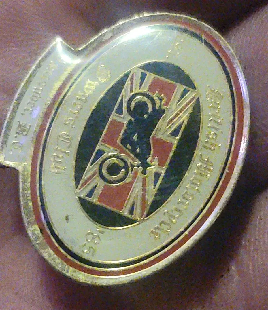 Selling a vintage British Motorcycle Club pin. It features the club's logo with the Union Jack and a motorcycle design. A great piece for collectors!