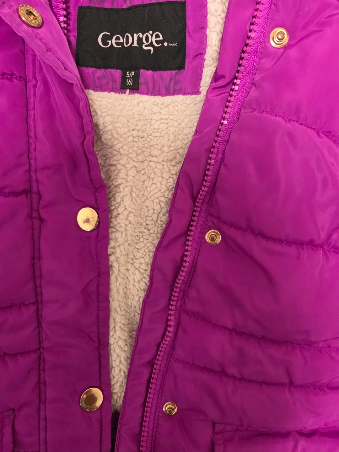 A lovely purple winter coat for girls, size 6 from George! It's in great condition and ready to keep someone warm this winter season. Features a cozy fur-lined hood and a stylish design