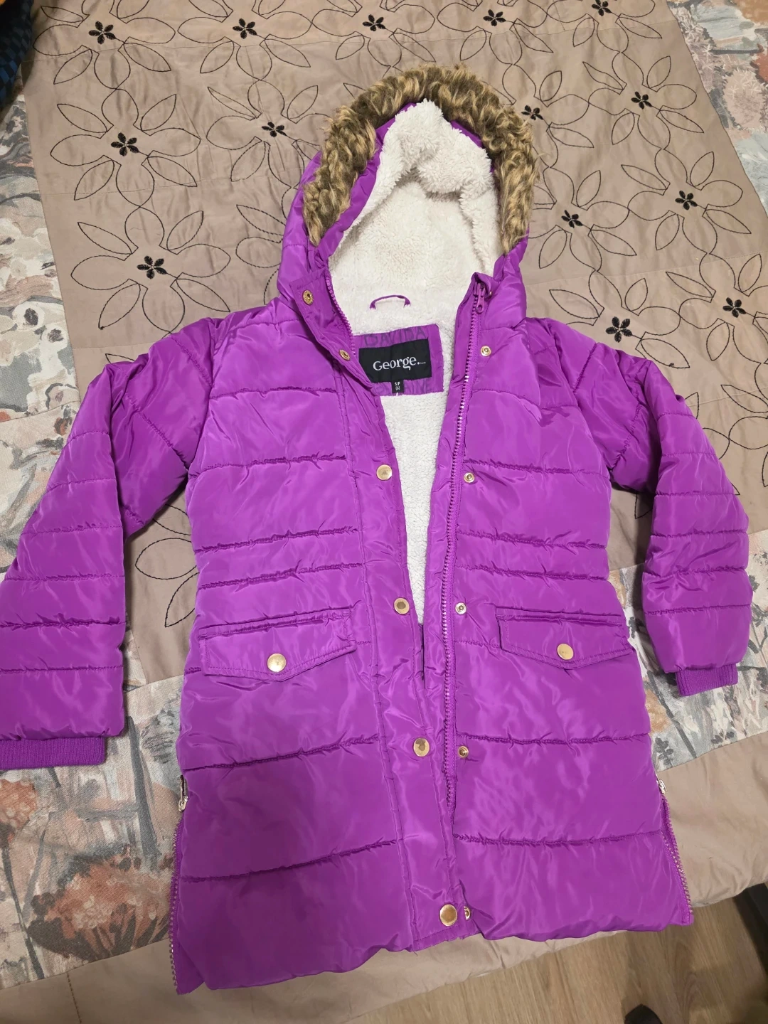 A lovely purple winter coat for girls, size 6 from George! It's in great condition and ready to keep someone warm this winter season. Features a cozy fur-lined hood and a stylish design