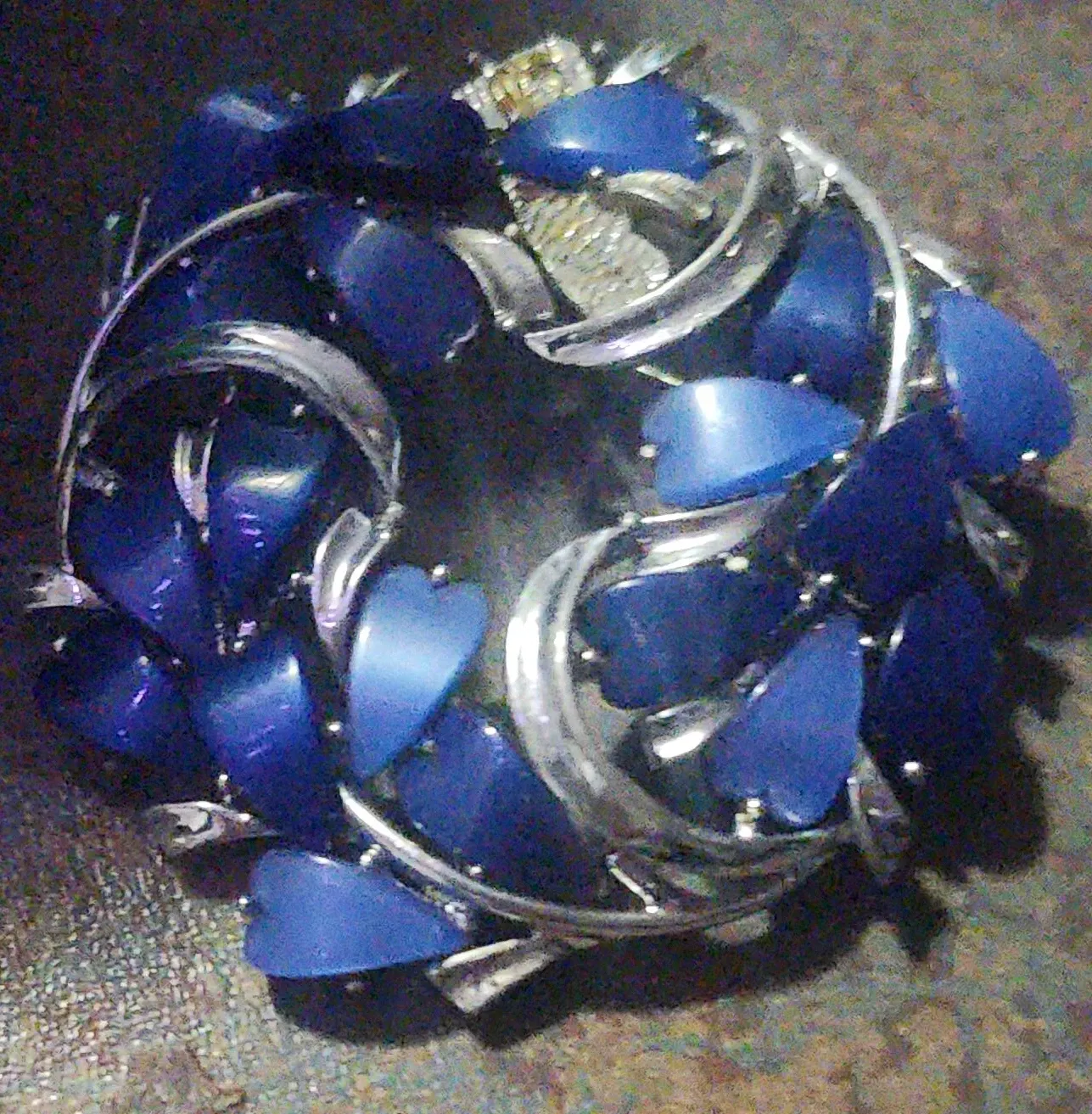 This is a lovely vintage brooch featuring blue stones set in a silver-tone metal. It's a unique piece that would add a touch of vintage charm to any outfit. The brooch is in good condition and ready to wear!
