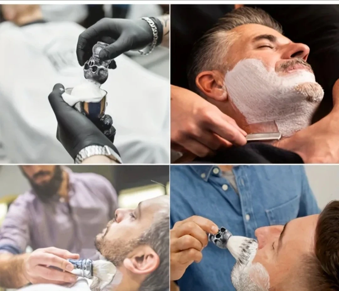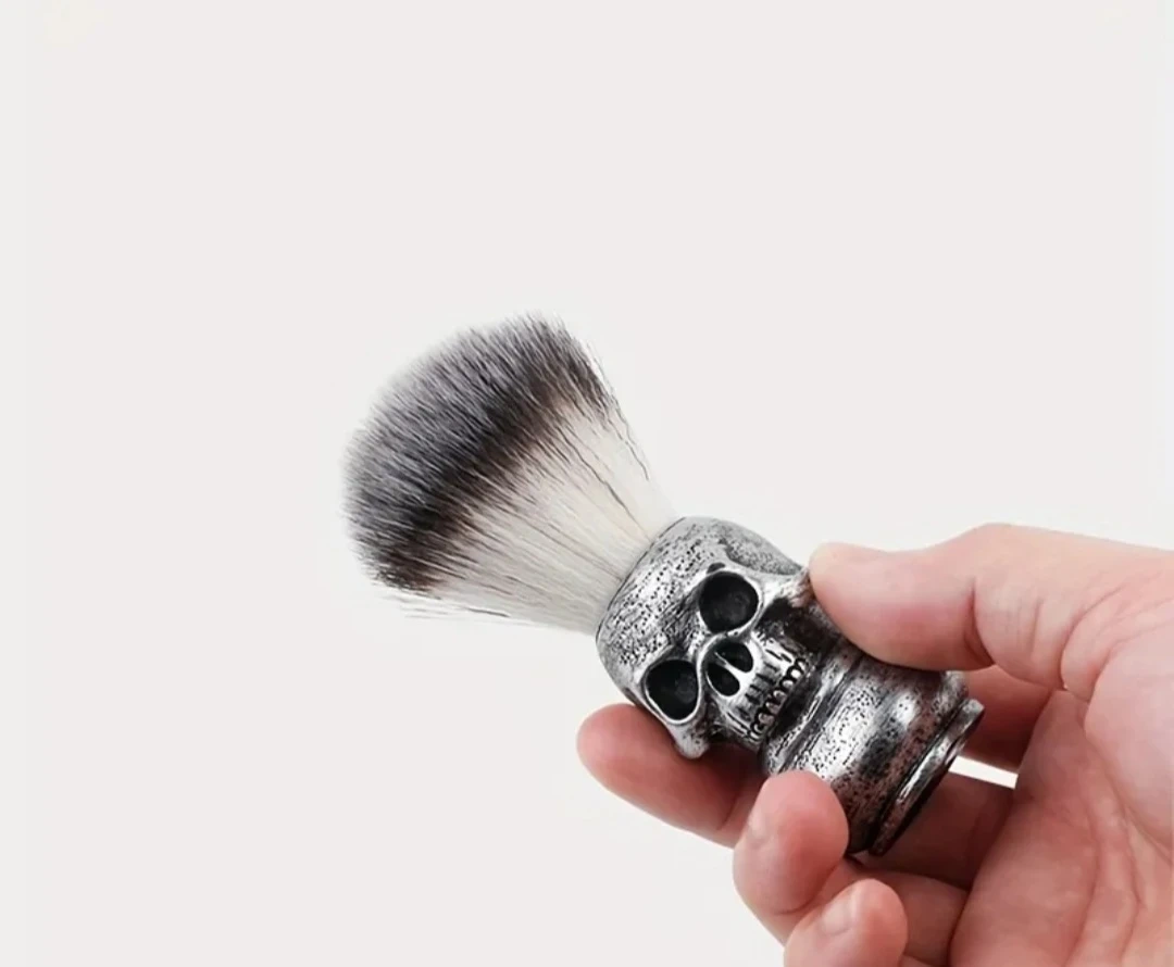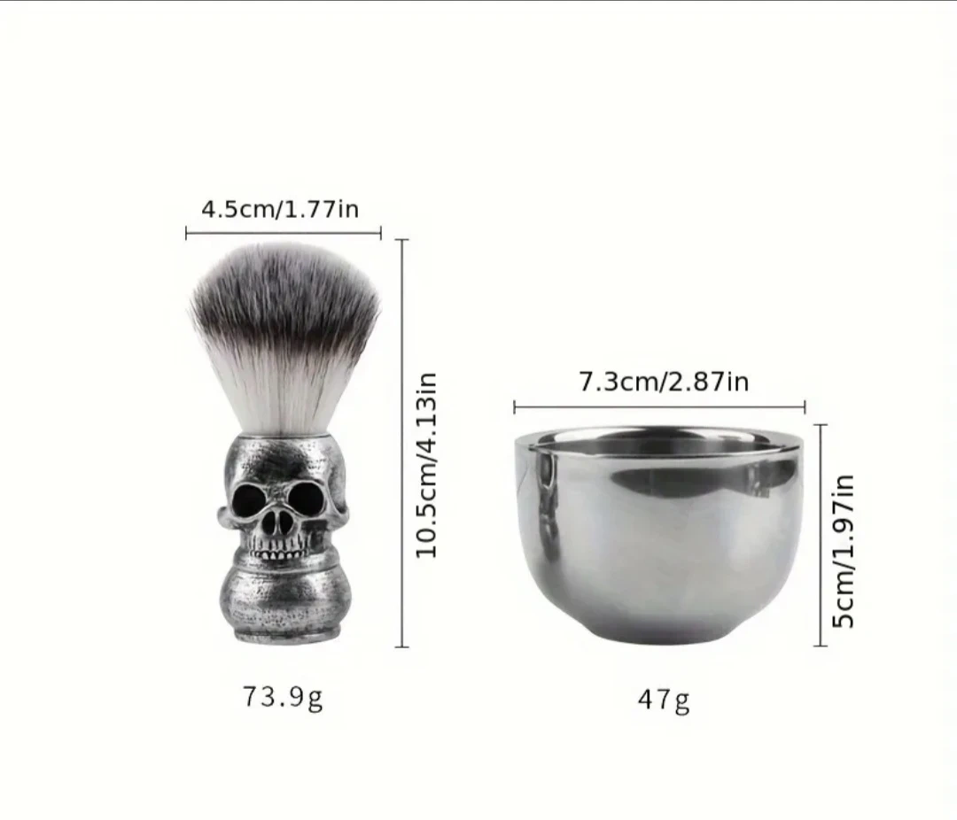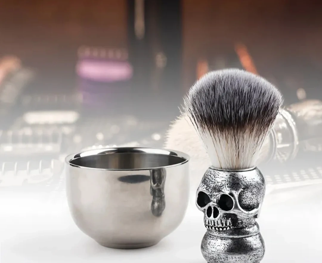 Looking to add a bit of edge to your grooming routine? Check out this cool shaving brush and bowl set! The brush has a unique skull handle, and the bowl is a sleek silver colour. Perfect for creating a rich lather for a smooth shave
