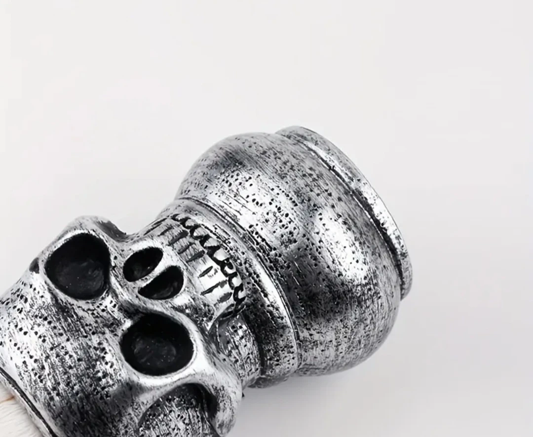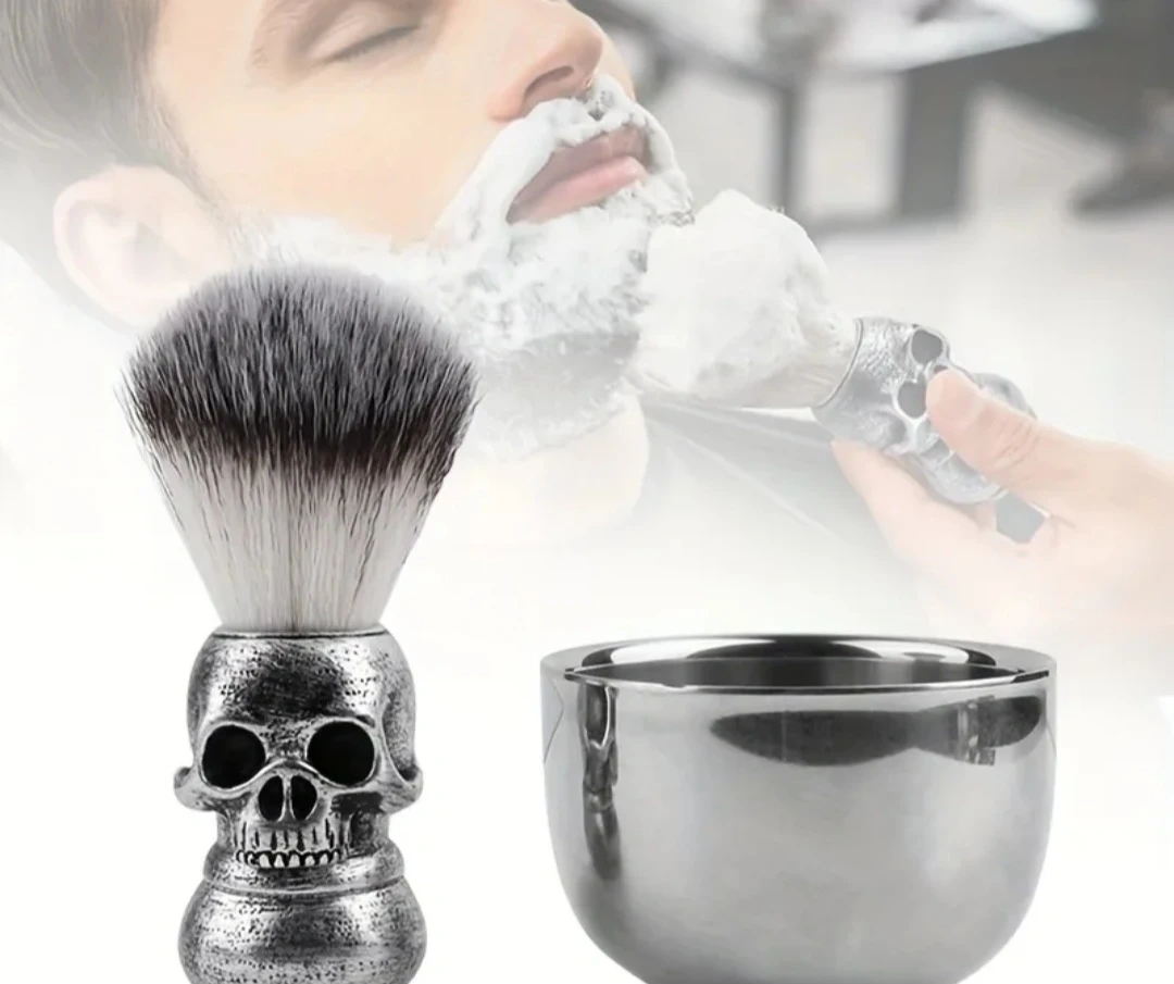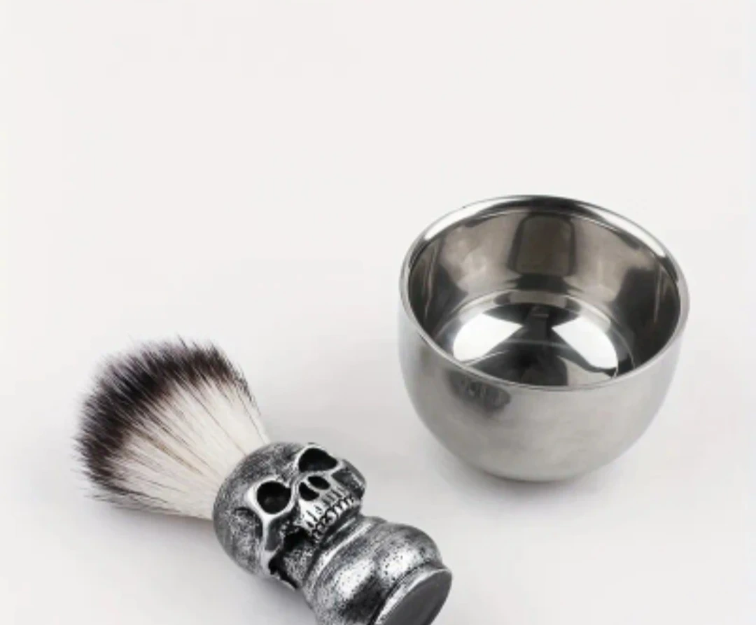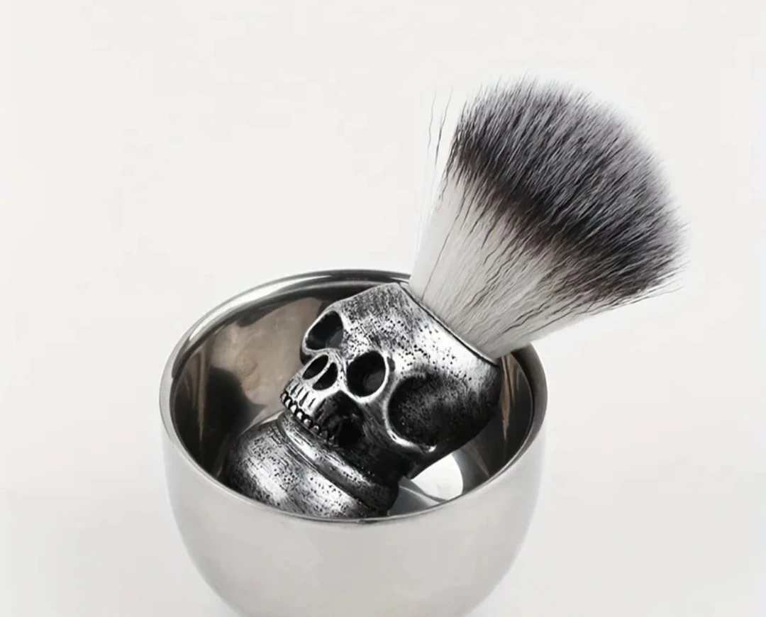 Looking to add a bit of edge to your grooming routine? Check out this cool shaving brush and bowl set! The brush has a unique skull handle, and the bowl is a sleek silver colour. Perfect for creating a rich lather for a smooth shave