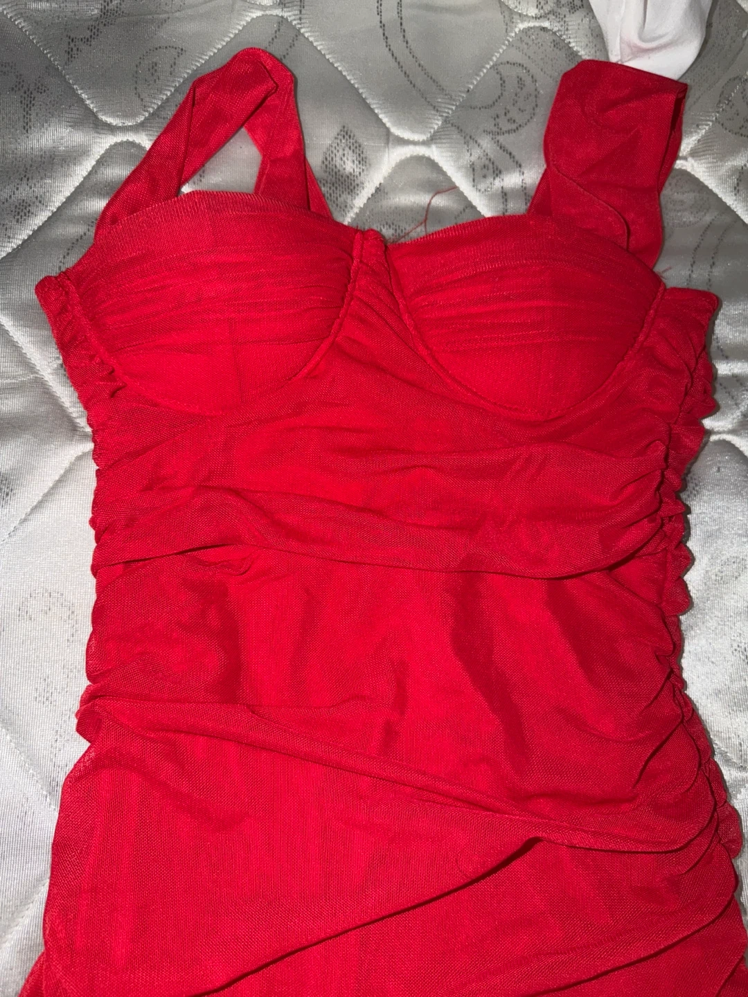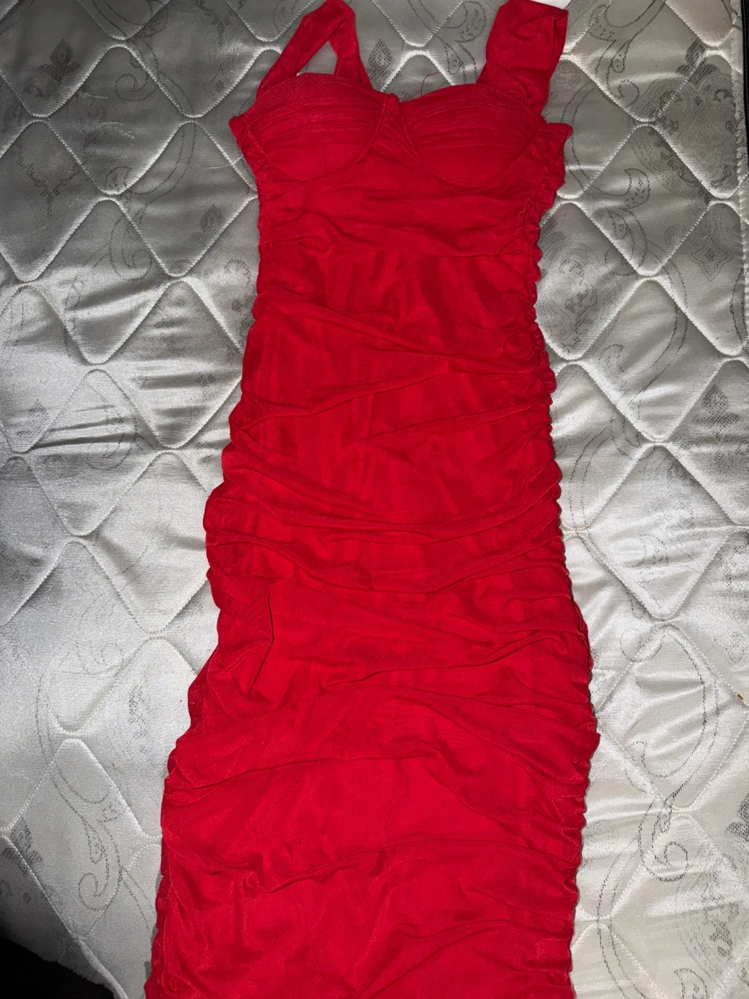 Selling a cute red ruched bodycon mini dress! It's perfect for a night out or a special occasion. The ruching detail is super flattering and the bright red colour is sure to turn heads