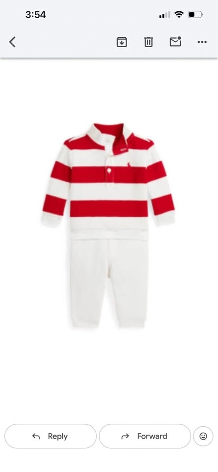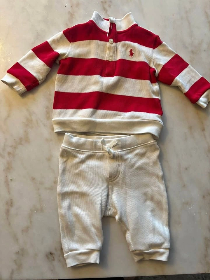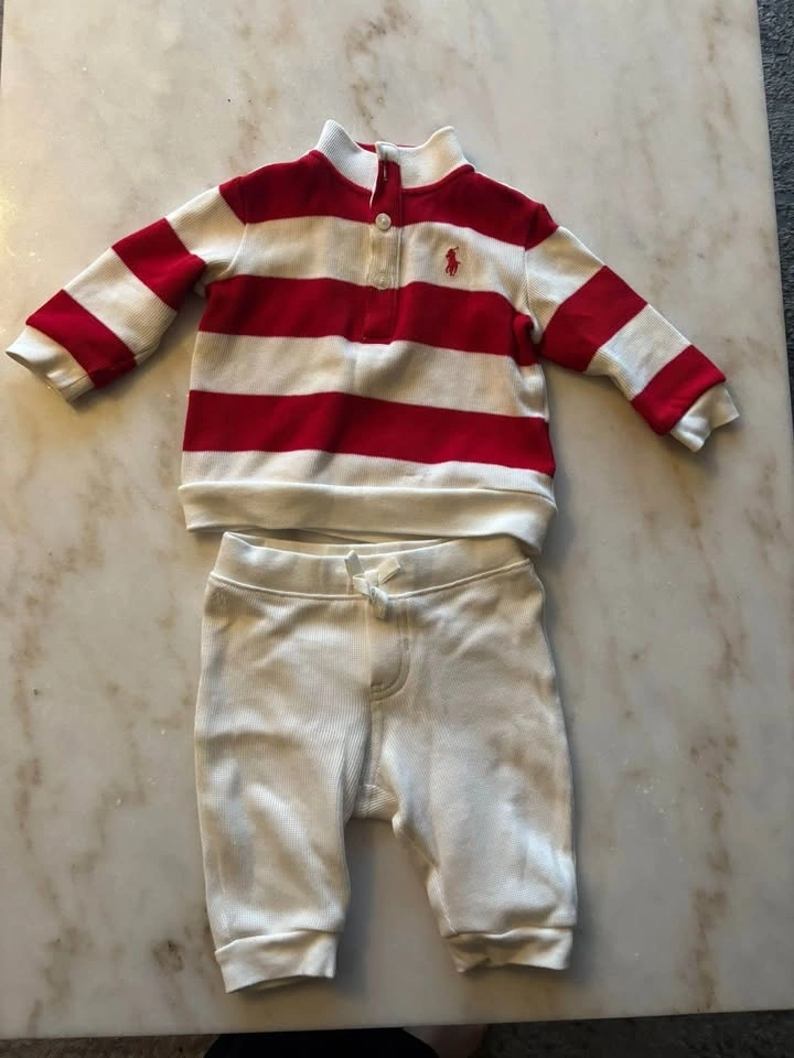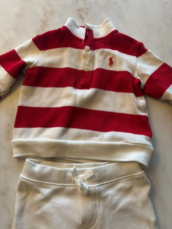 Great condition baby outfit! Red and white striped long sleeve shirt with a collar and white pants. Shirt has a small embroidered logo on the chest. Looks like a Ralph Lauren outfit.