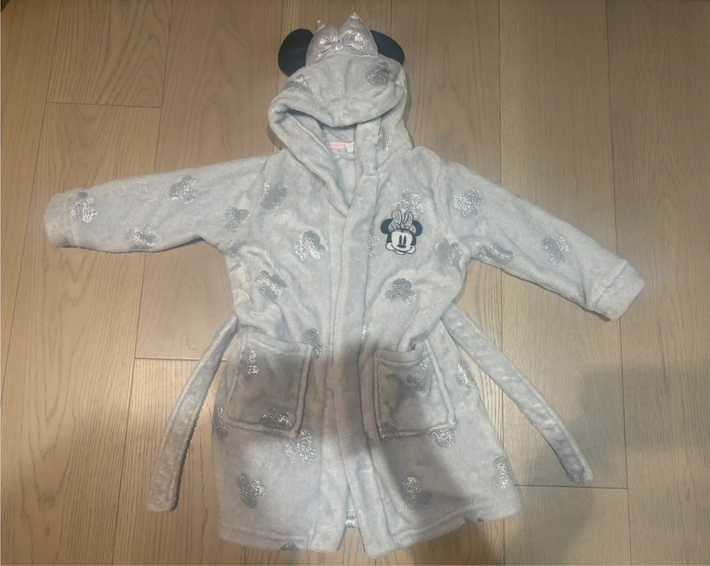 Cozy Disney Minnie Mouse robe for kids aged 4-5 years! This adorable robe is in great condition and features a hood with Minnie's ears and a cute Minnie Mouse design. Perfect for keeping your little one warm after bath time or just lounging around the house.