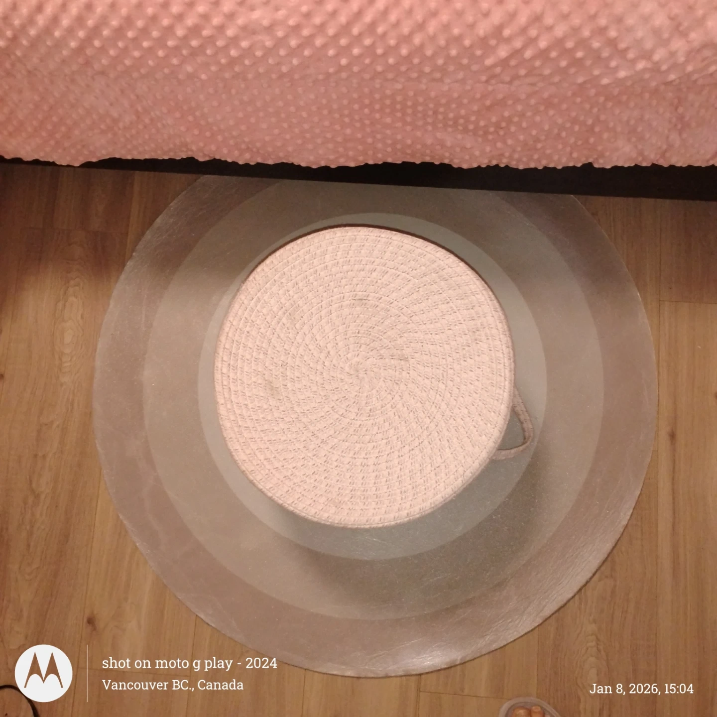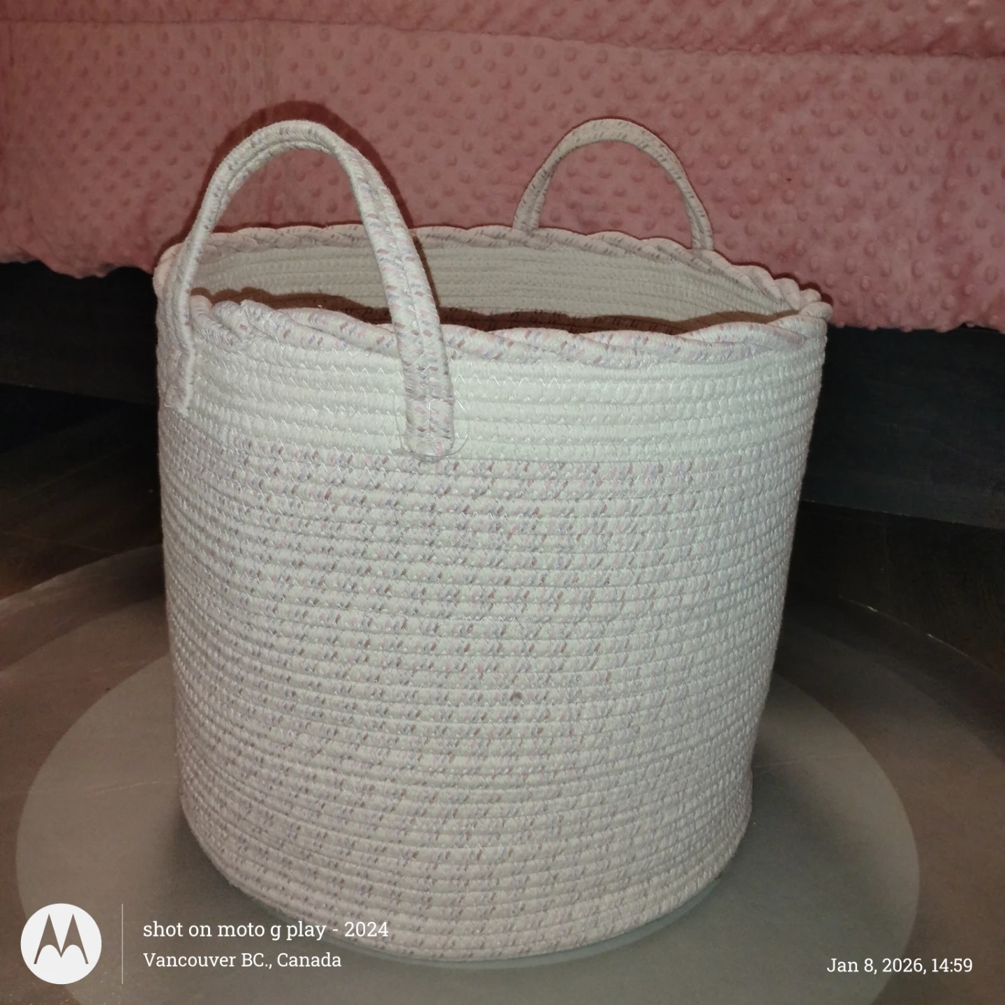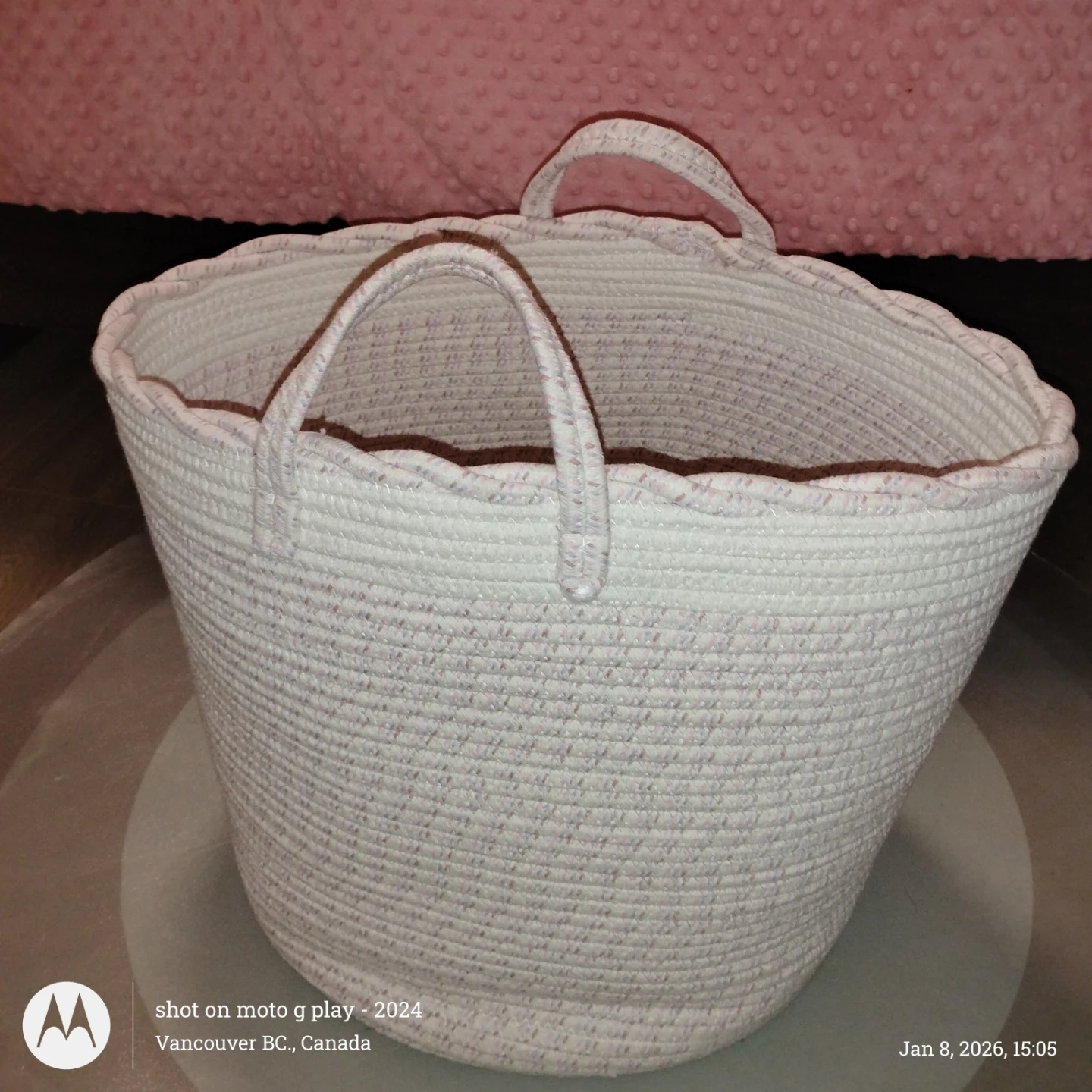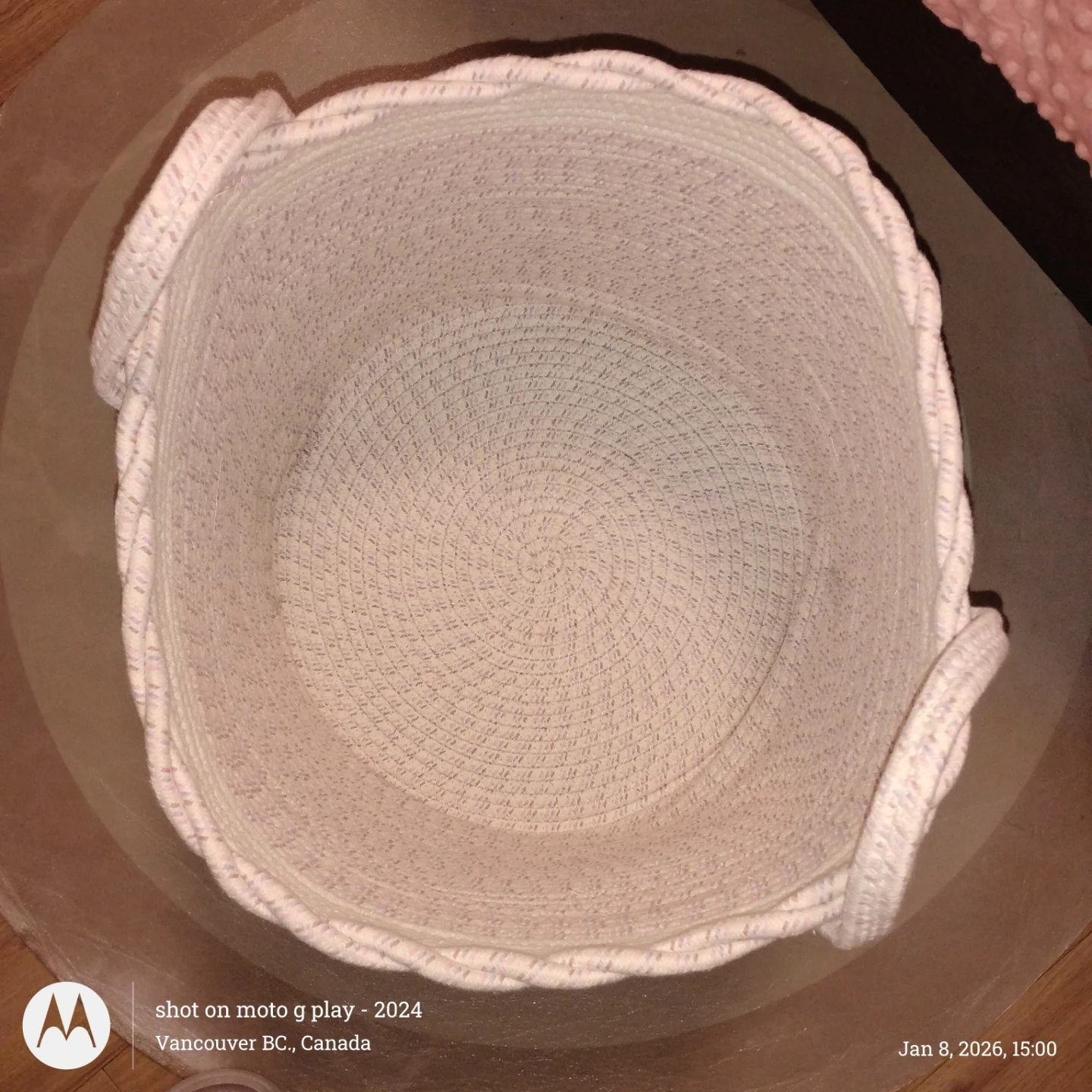 A refined and timeless addition to a space that values craftsmanship, quiet elegance, and authentic European textile artistry. lovely woven rope basket! It's perfect for storage or decor. It has two sturdy handles for easy carrying. The basket features a nice woven pattern with subtle pink.