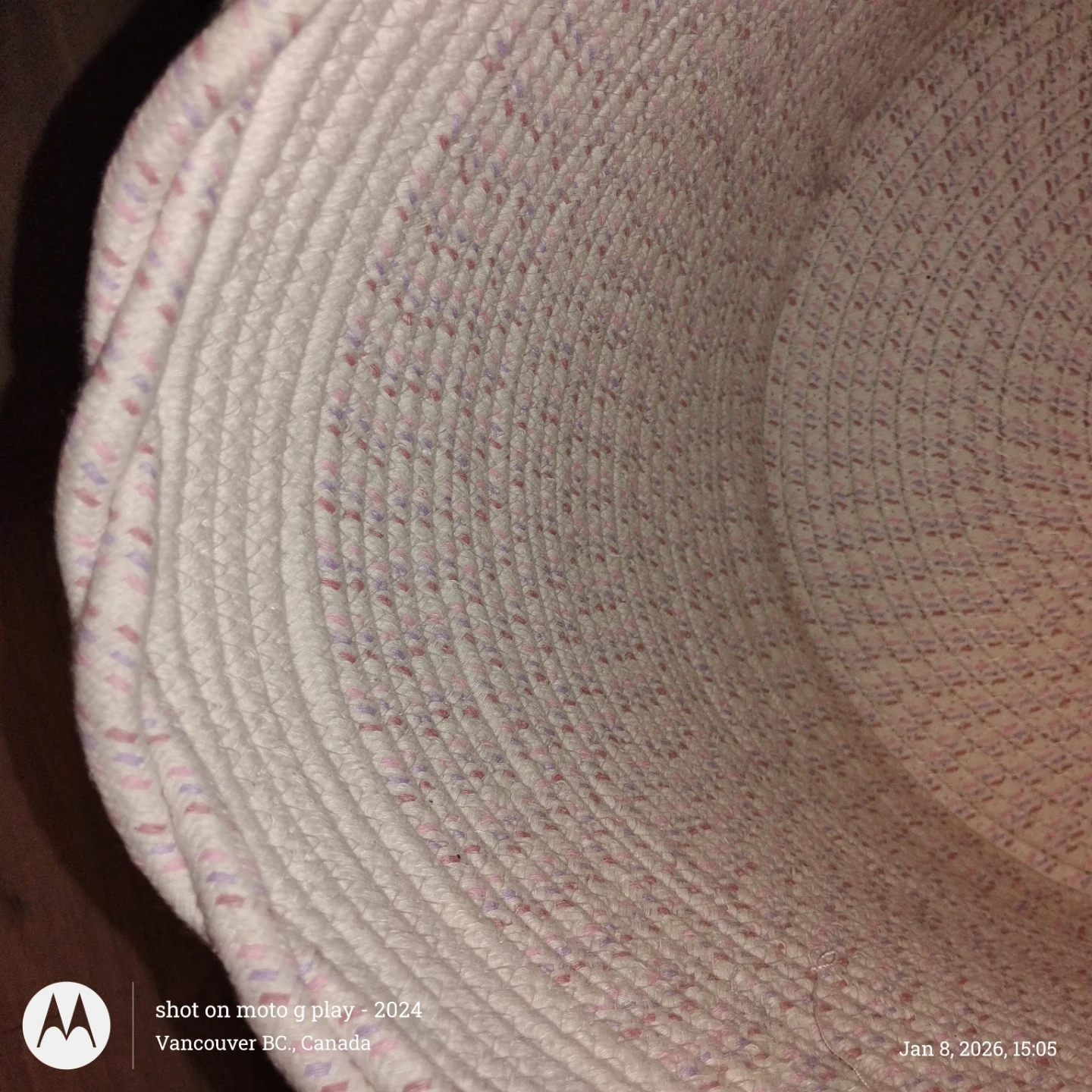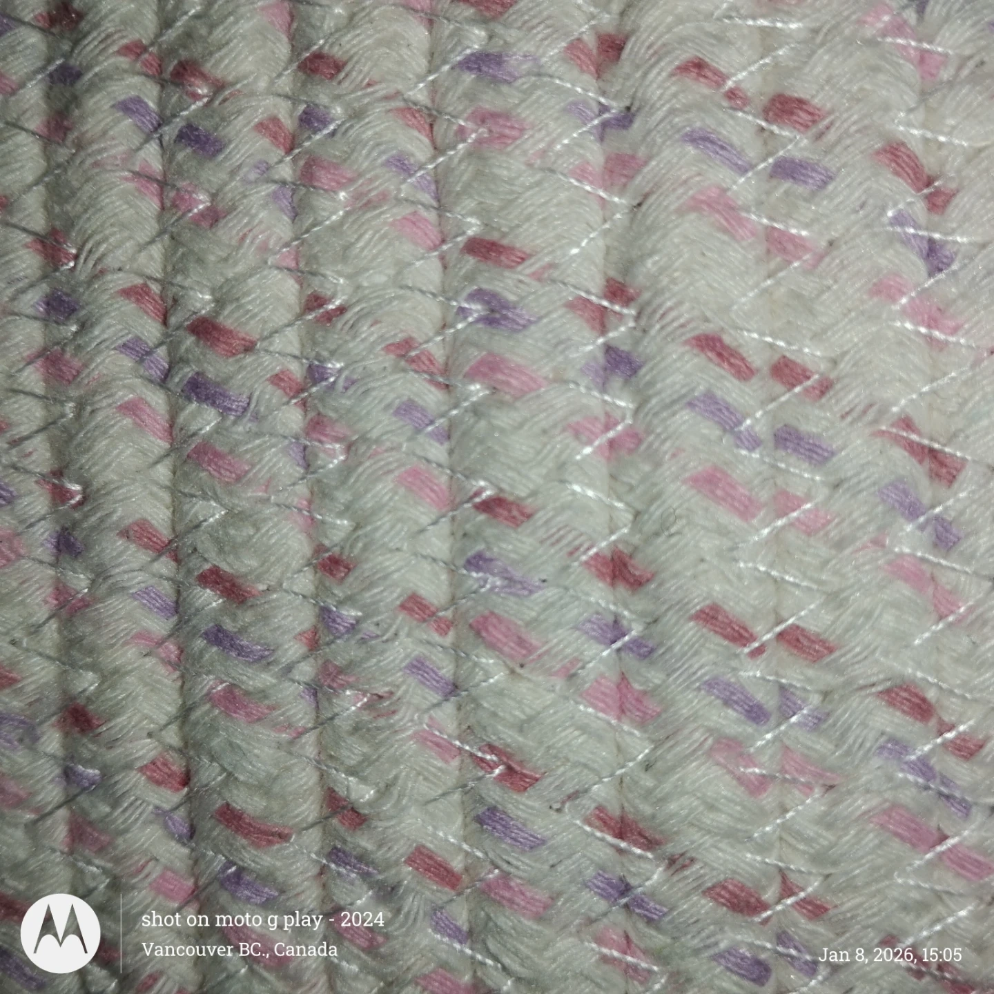 • Textured cotton rope in an elegant blend of soft white, rose, and muted lavender fibers