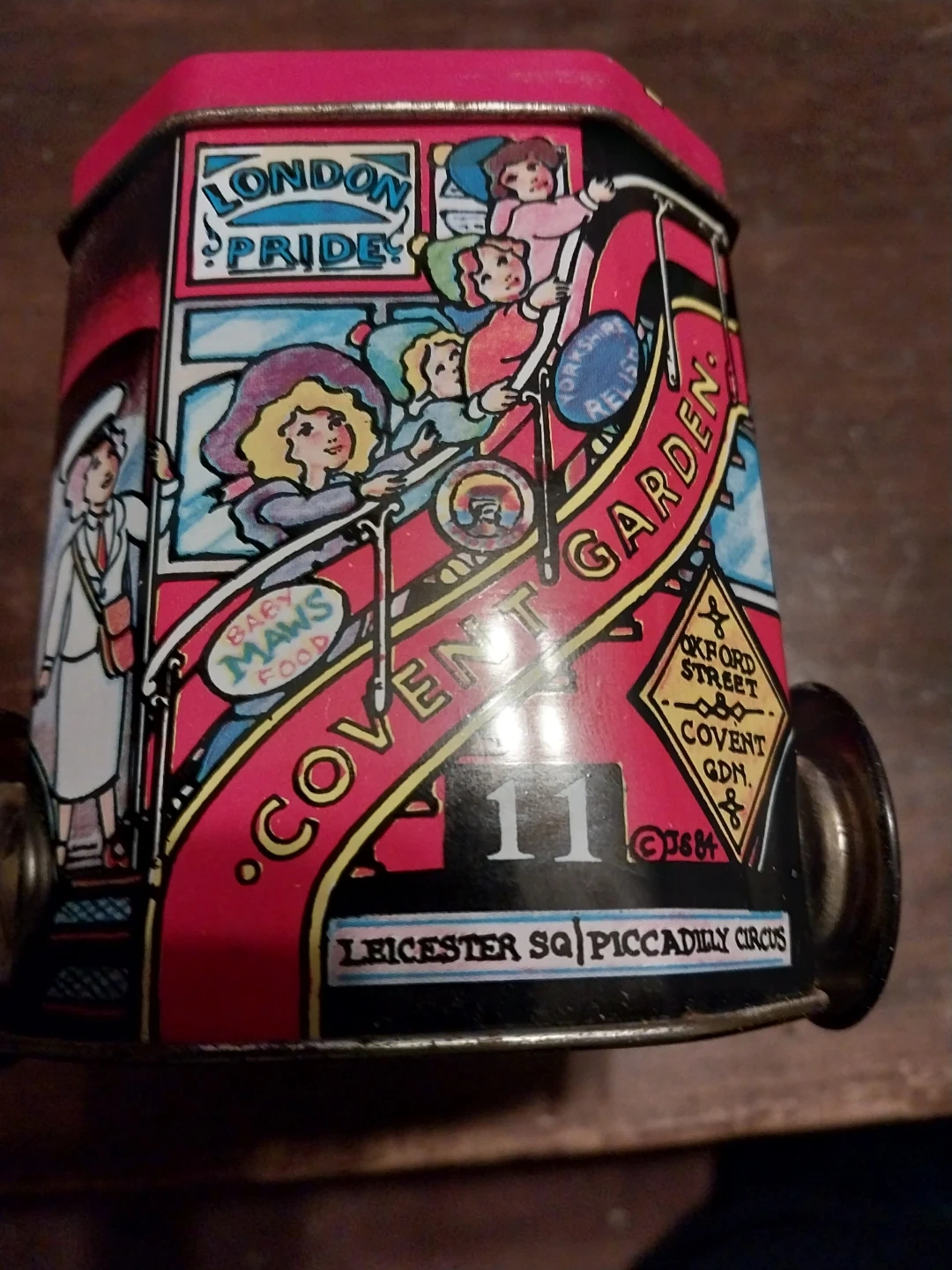 Selling a vintage Cravens of York London Bus tin. It once contained English Fruit Candy. The tin is decorated with colorful London scenes and has wheels. Great for collectors or as a decorative piece
