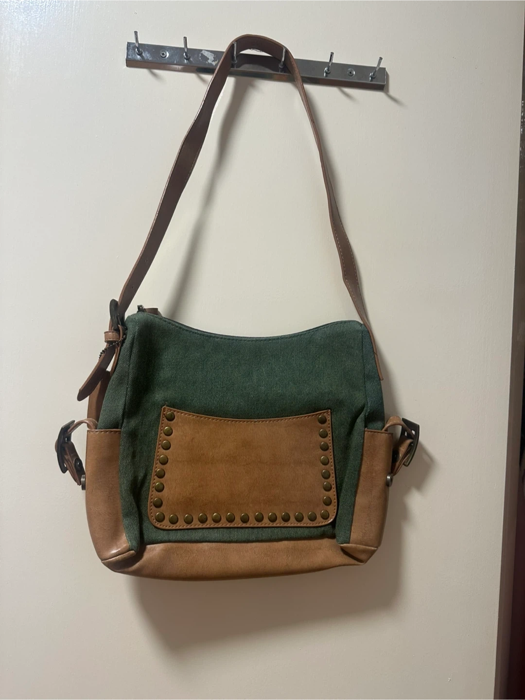 This is a cute Chunson shoulder bag in a mix of green and brown tones. It's got a unique look with the studded pocket detail. Perfect for everyday use!