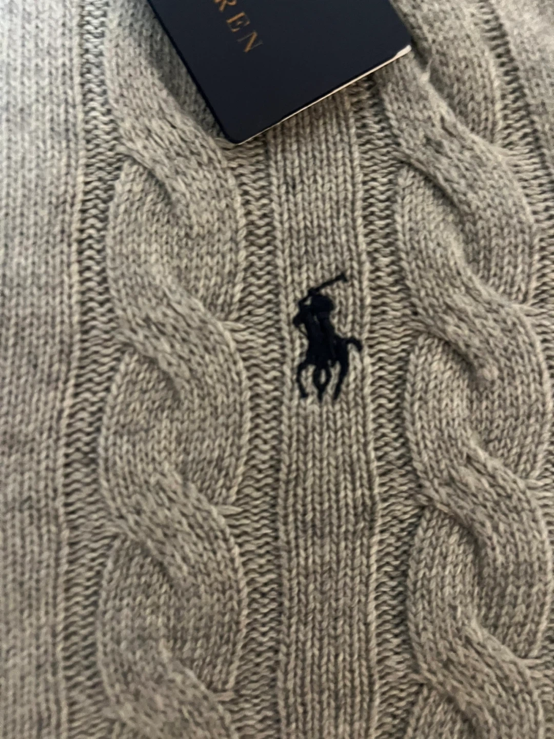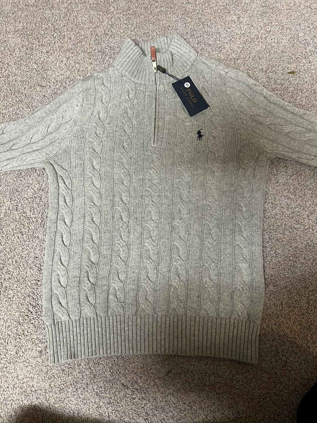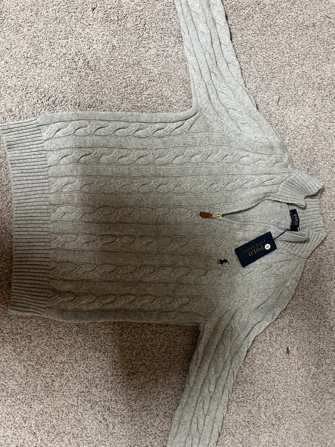 Selling a brand new with tags Polo Ralph Lauren cable knit sweater! It's a size small and features a classic cable knit design. The sweater is a light grey colour and has a quarter-zip closure. Perfect for staying warm and stylish!