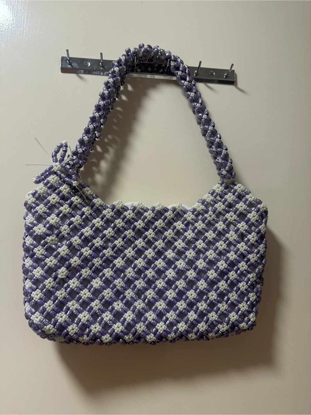 Selling a unique handmade shoulder bag! It features a beautiful beaded design in purple and white. The bag has a zipper closure and a comfortable shoulder strap. Perfect for adding a touch of handmade charm to your outfit!