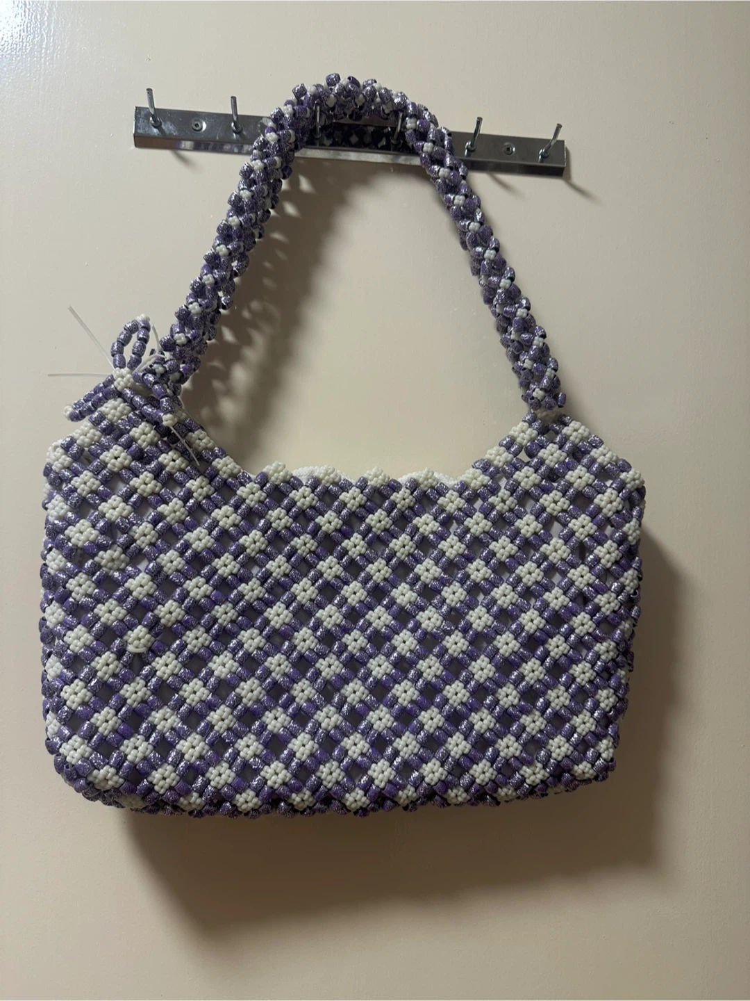 Selling a unique handmade shoulder bag! It features a beautiful beaded design in purple and white. The bag has a zipper closure and a comfortable shoulder strap. Perfect for adding a touch of handmade charm to your outfit!