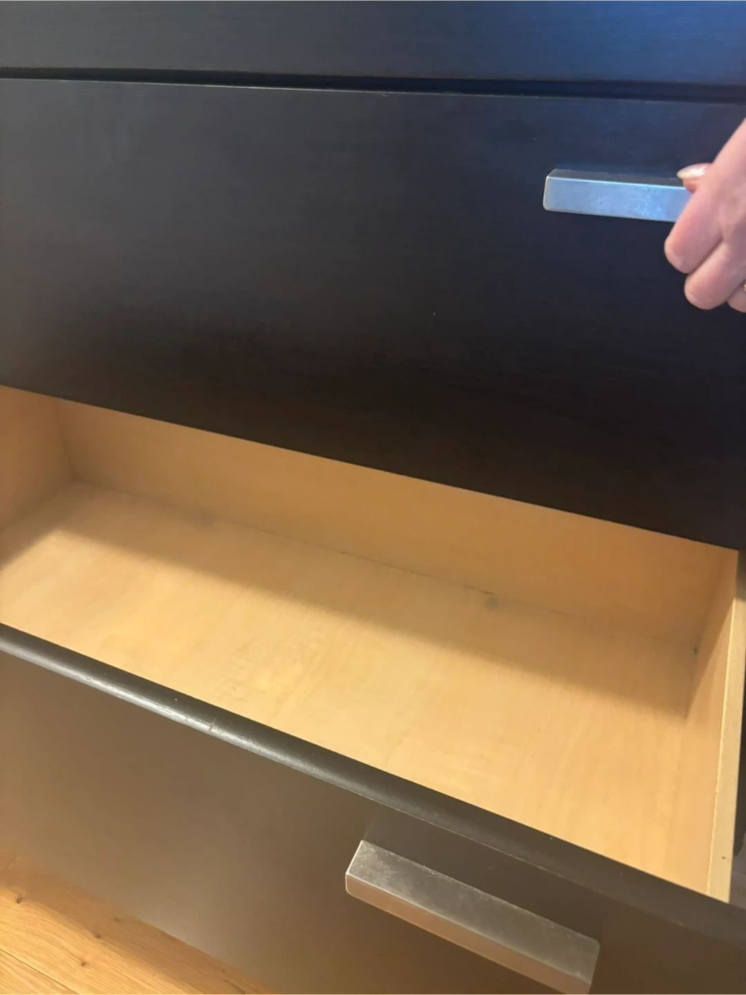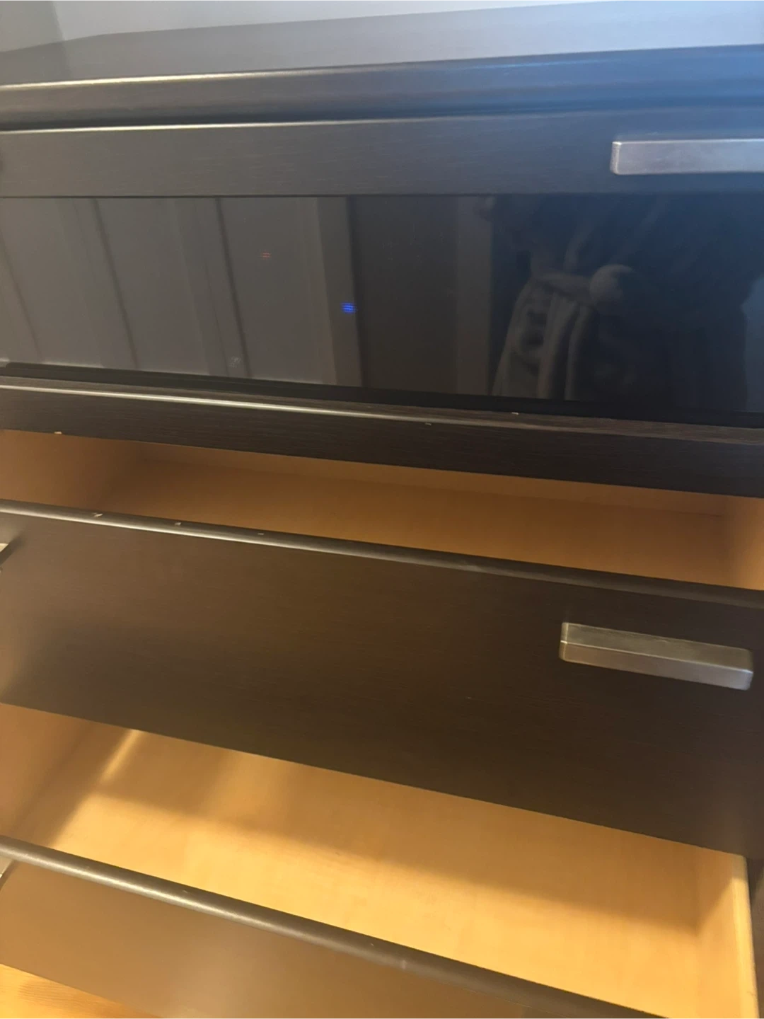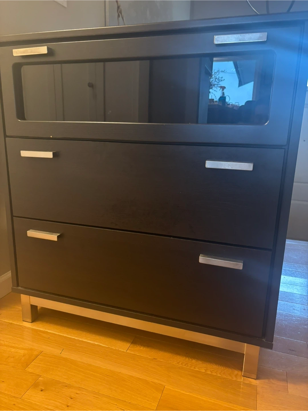 Selling a dark brown dresser in good condition. It features three drawers and a cabinet with a shelf. Perfect for adding storage to any bedroom or living space