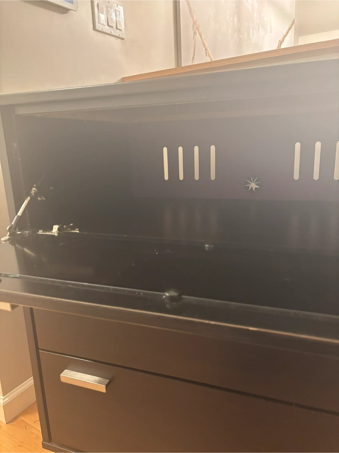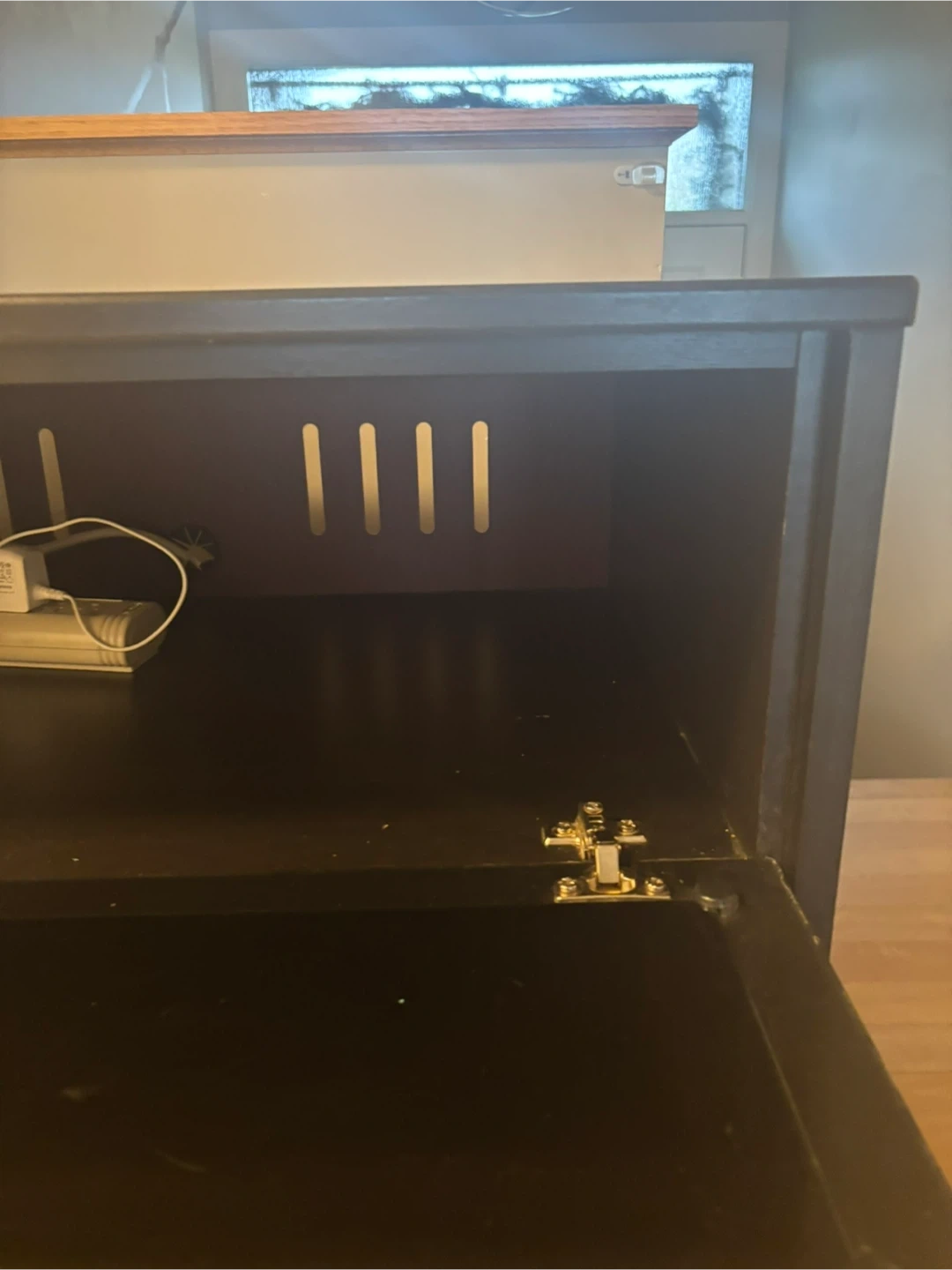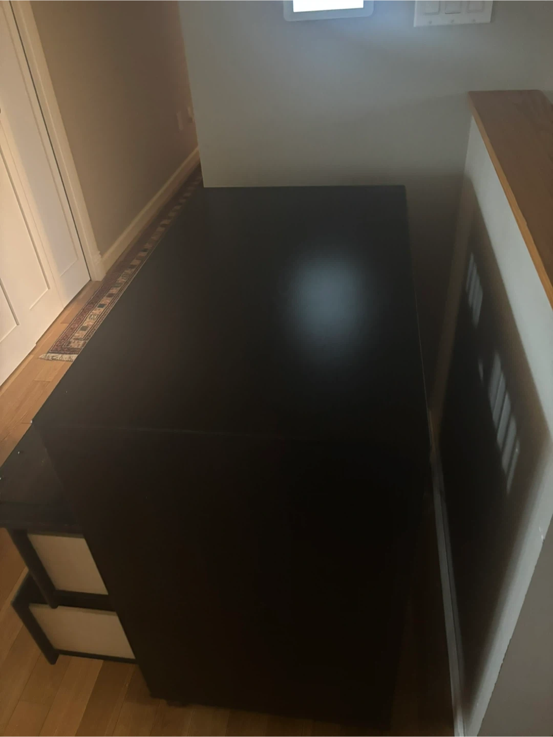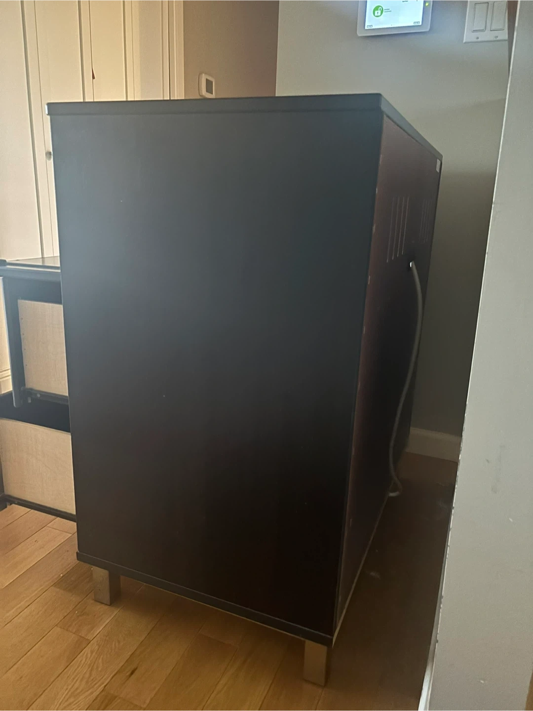 Selling a dark brown dresser in good condition. It features three drawers and a cabinet with a shelf. Perfect for adding storage to any bedroom or living space
