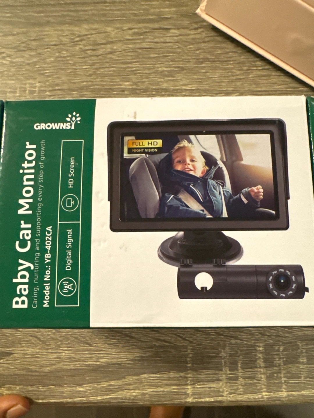 Selling a brand new Grownsy Baby Car Monitor, model YB-402CA. It's still in its original box and has never been used! This monitor helps you keep an eye on your little one while driving. It features a full HD screen with night vision and digital signal for clear viewing. Great for peace of mind on the road!