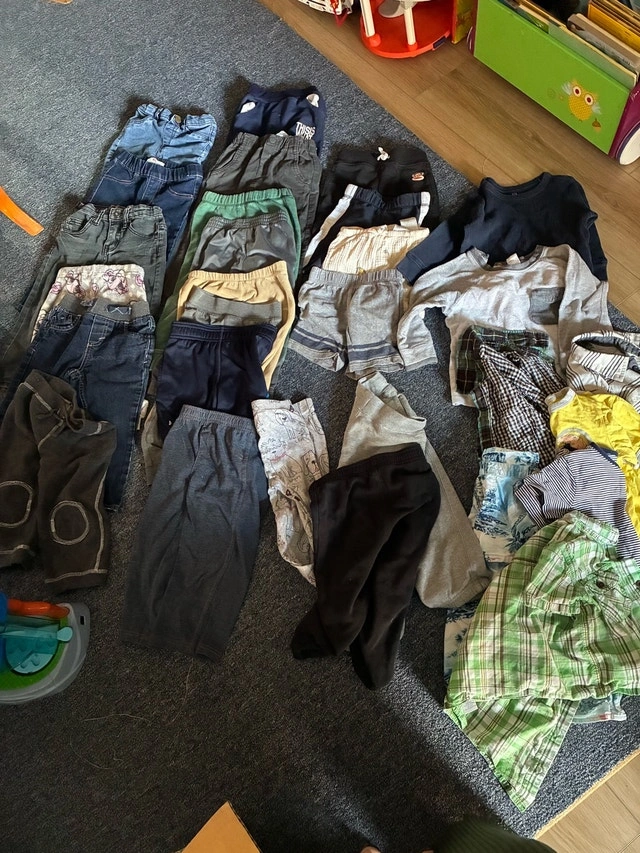 This is a used assorted lot of kids clothes, featuring a mix of pants, shirts, and more, perfect for stocking up a child's wardrobe. The condition of the clothing varies, but overall it's a great collection for everyday wear. * Sizes: Mixture of sizes, please see pictures for approximate sizing. ( a few 18 months but mostly 2T ) * Condition: Used, with varying degrees of wear. These clothes are looking for a new home, perhaps to a youngster ready for adventures or playdates! If you see this ad, the clothes are still available, ready to be whisked away to their next chapter.