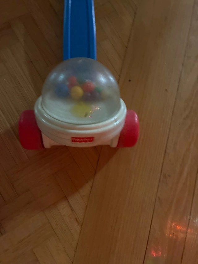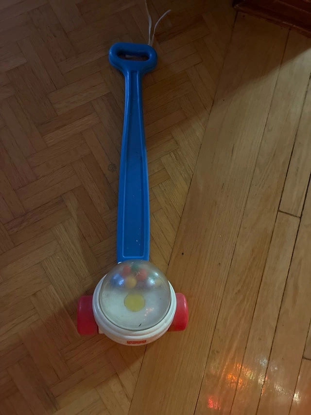 Relive the joy of childhood with this classic Fisher-Price Corn Popper push toy, featuring colourful balls that pop as it's pushed along! It's in used condition, ready for a new generation to enjoy. This charming toy isn't just about fun; it's a playful introduction to cause and effect, and helps encourage gross motor skill development as your little one strolls around. A perfect gift for the upcoming toddler in your life.