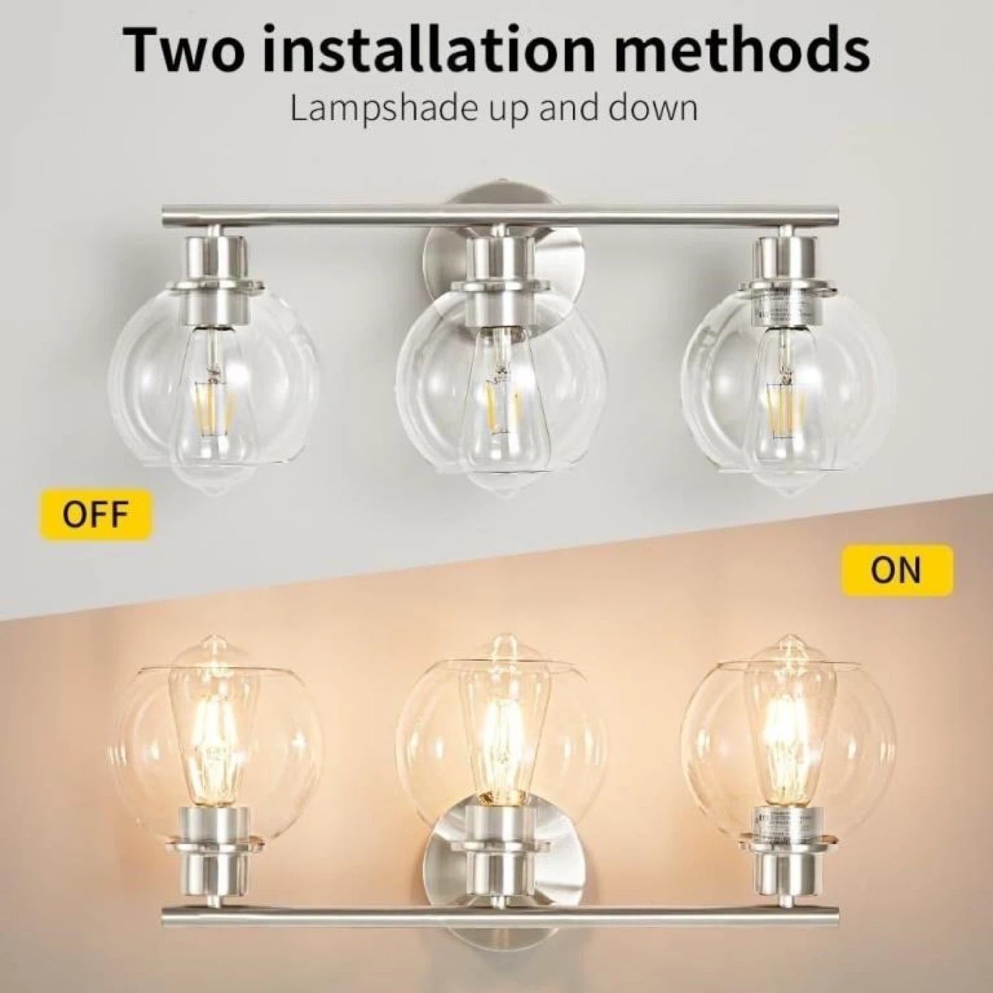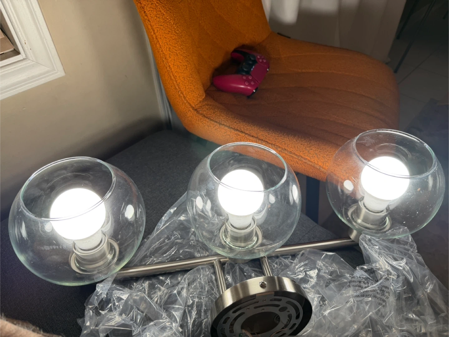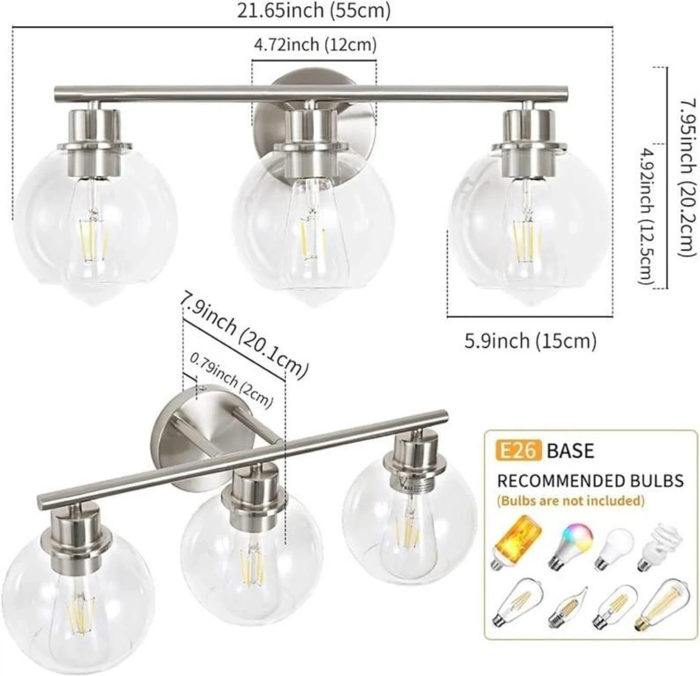 Selling a 3-light bathroom vanity light fixture. It features a brushed silver finish and clear glass globe shades.
