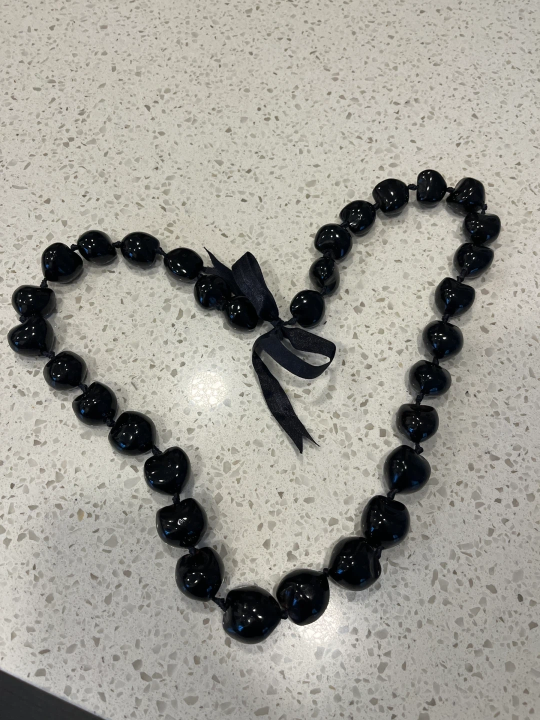 1990’s Authentic Hawaiian kukui nut lei necklace made from real candlenuts, hand-polished to a deep glossy black finish. Each nut is individually knotted on cord, reflecting traditional craftsmanship. Finished with a ribbon tie for adjustable wear.