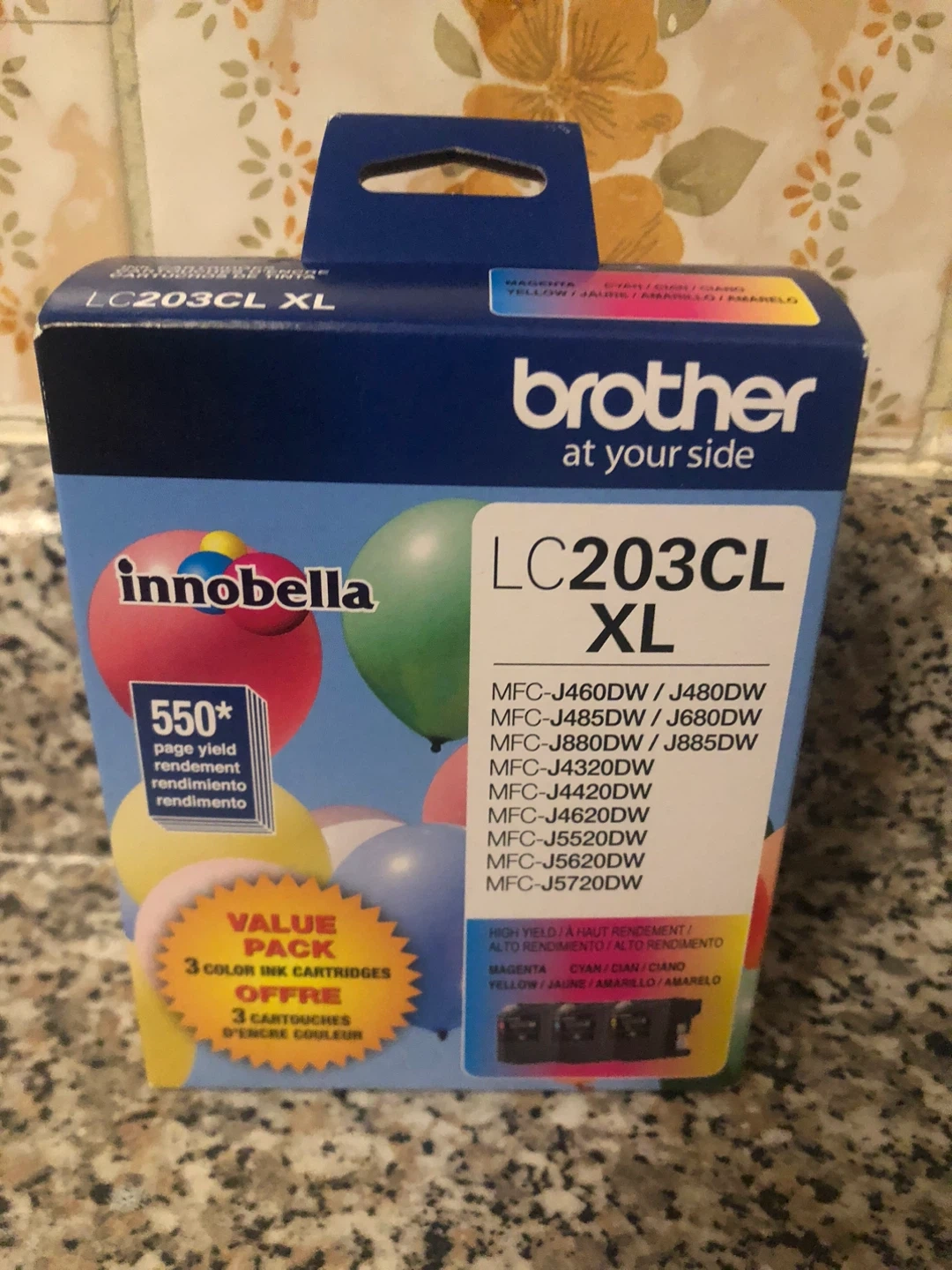 Selling a Brother LC203CL XL ink cartridge value pack. This includes 3 colour ink cartridges. It's compatible with a range of MFC-J models, including J460DW, J480DW, J485DW, J680DW, J880DW, J885DW, J4320DW, J4420DW, J4620DW, J5520DW, J5620DW, and J5720DW