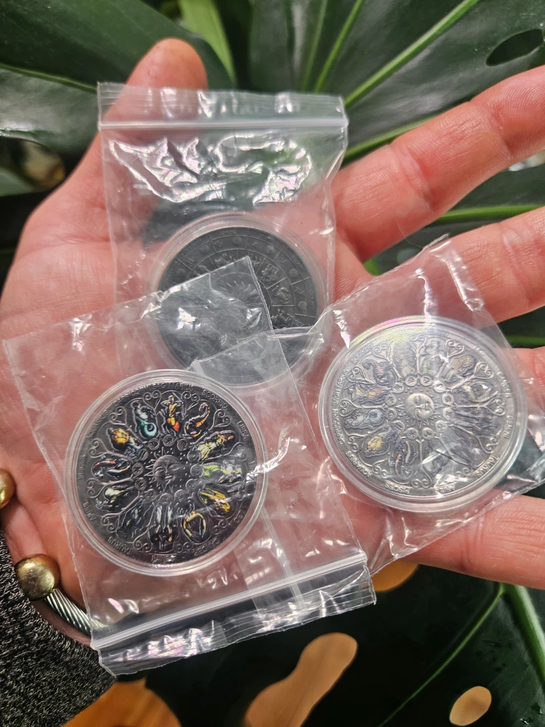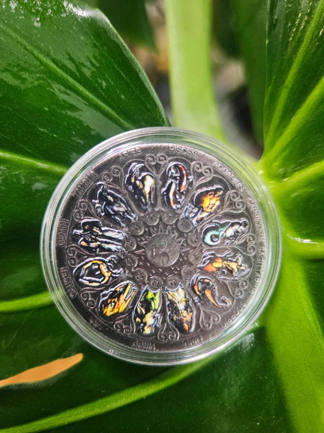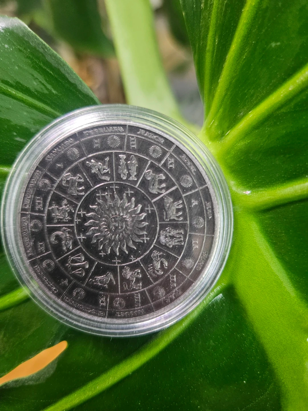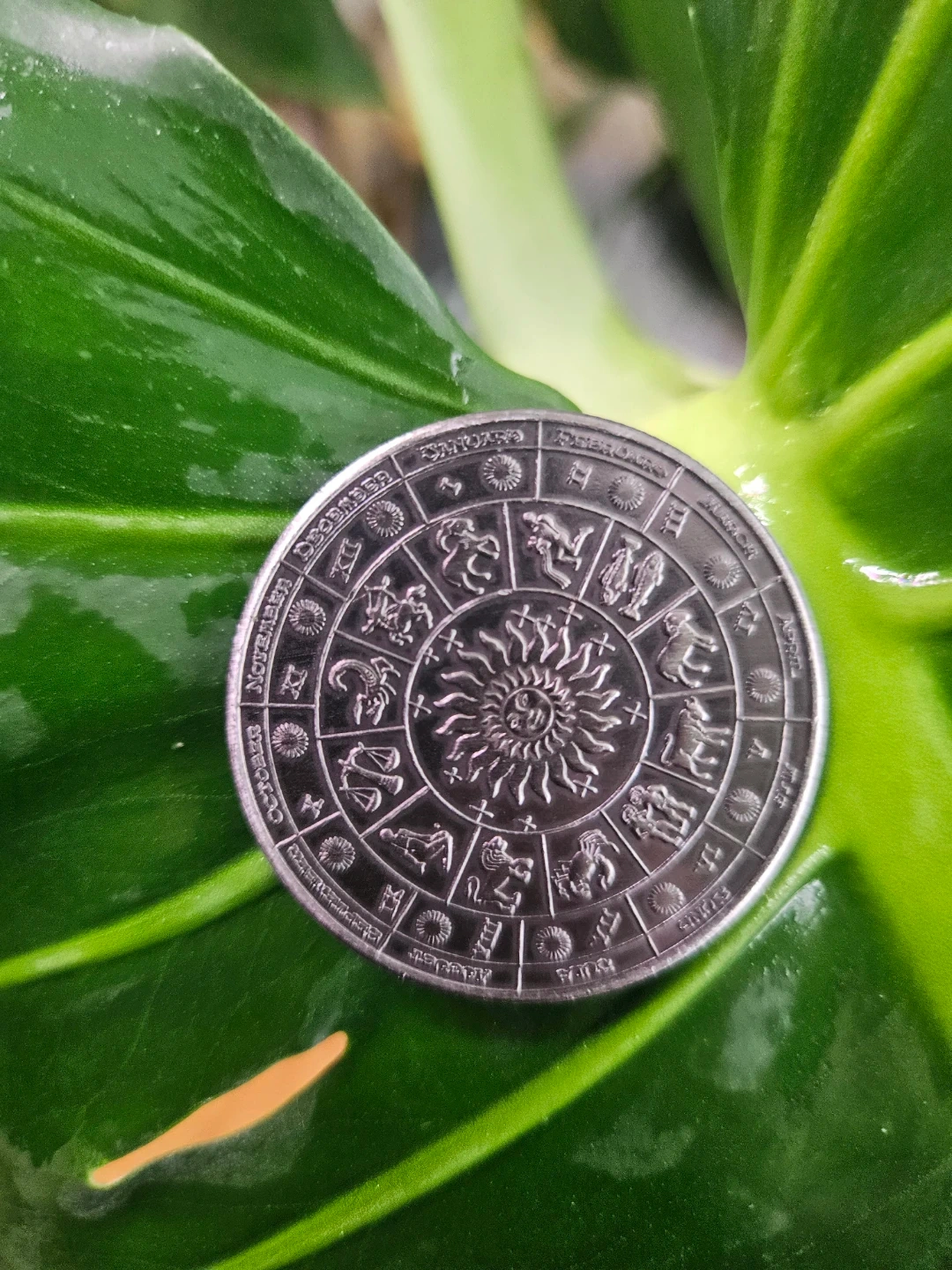 A coin featuring zodiac signs! It has all twelve signs around the edges, with detailed illustrations. The coins are brand new and come in protective cases.