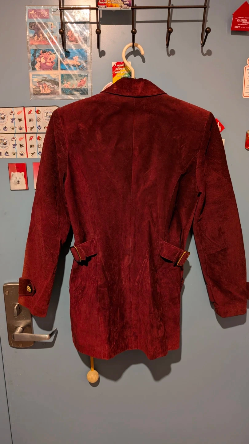Here's a Danier blazer in a beautiful burgundy colour! It's made of suede and is a size XS. Perfect for adding a touch of class to any outfit. Only been tried on and bought then stored it away.