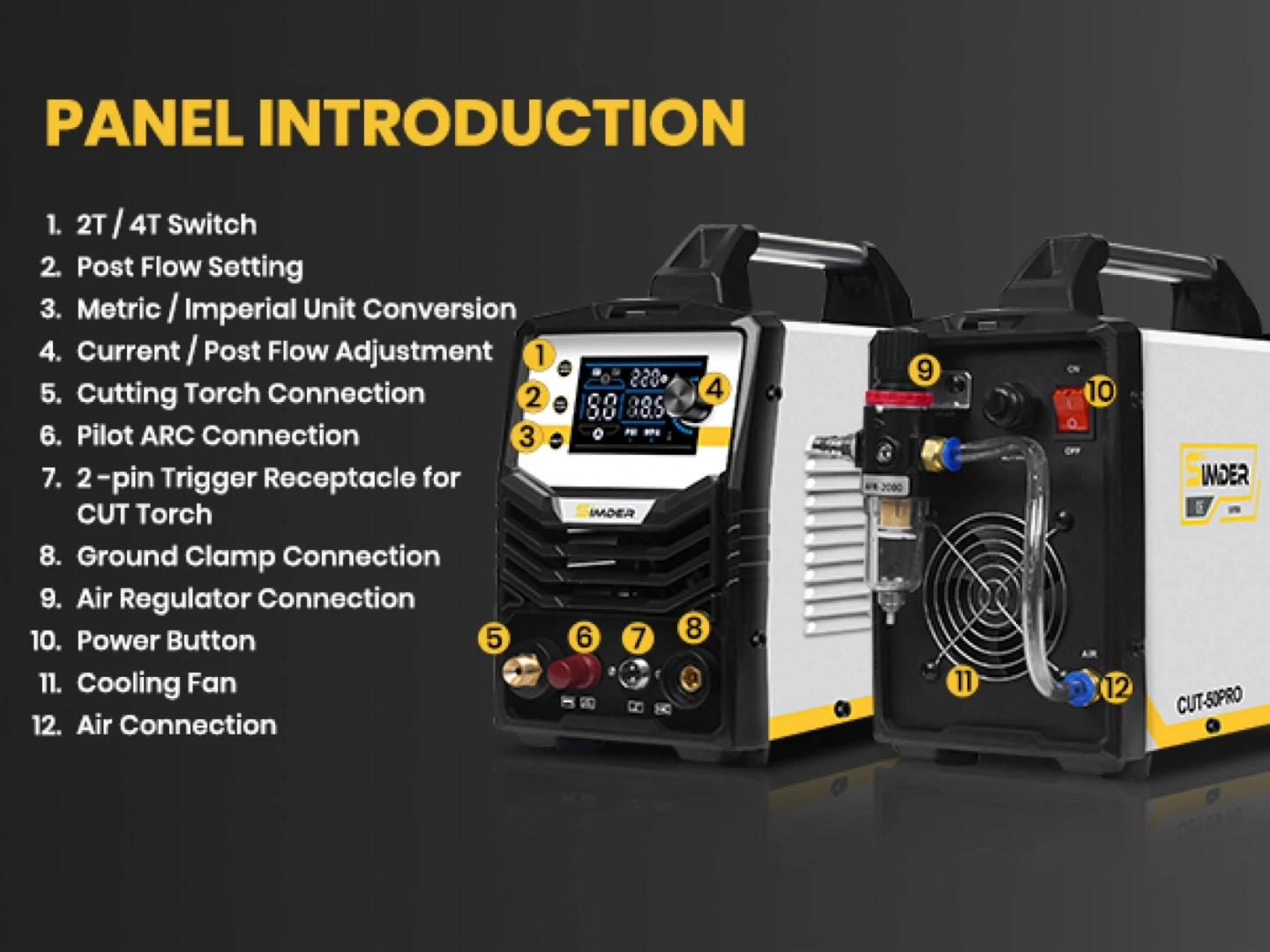 Selling a brand new SIMDER Pilot Arc Plasma Cutter, model CUT-50PRO! It comes with the original box and all included components. This cutter features a 2T/4T switch, post flow setting, metric/imperial unit conversion, and current/post flow adjustment. It also has connections for the cutting torch and pilot ARC, a 2-pin trigger receptacle for the CUT torch, a ground clamp connection, and air regulator connection. It also includes a power button, cooling fan, and air connection