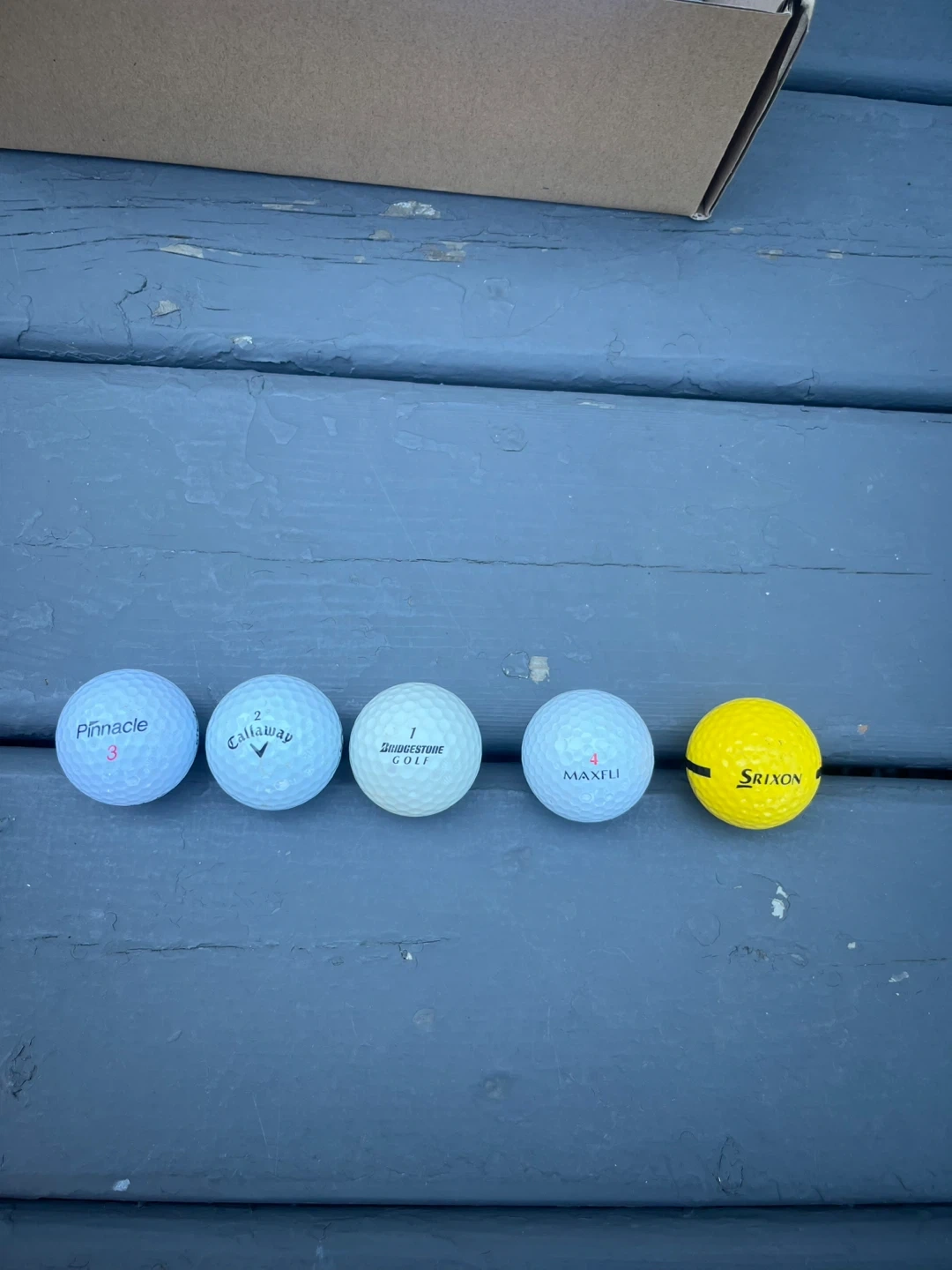 Selling a collection of mixed golf balls. Brands include Pinnacle, Callaway, Bridgestone, Maxfli, and Srixon with 36 total balls in the box.