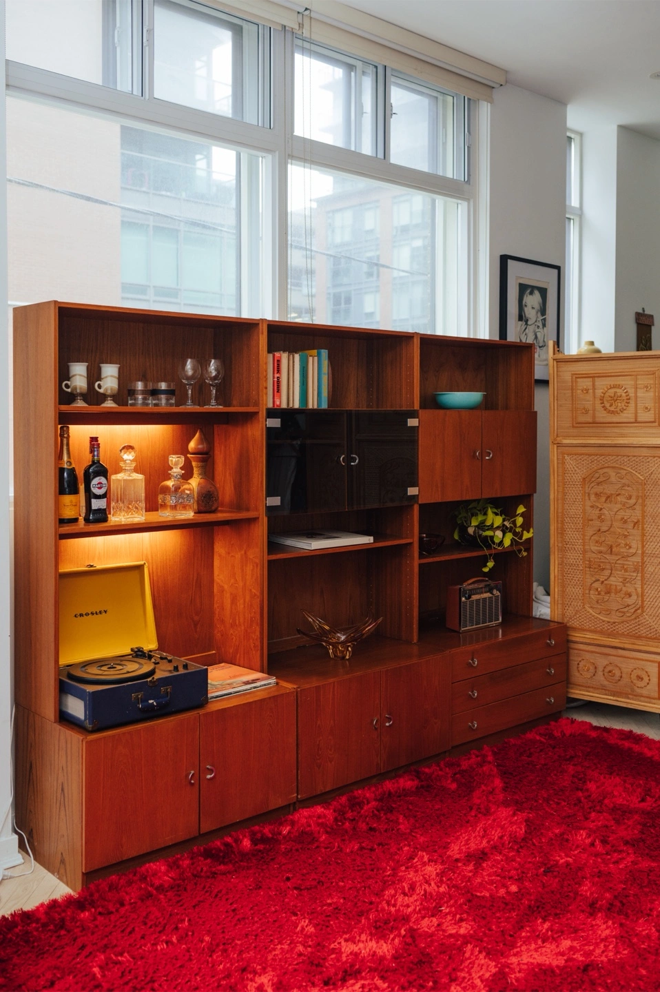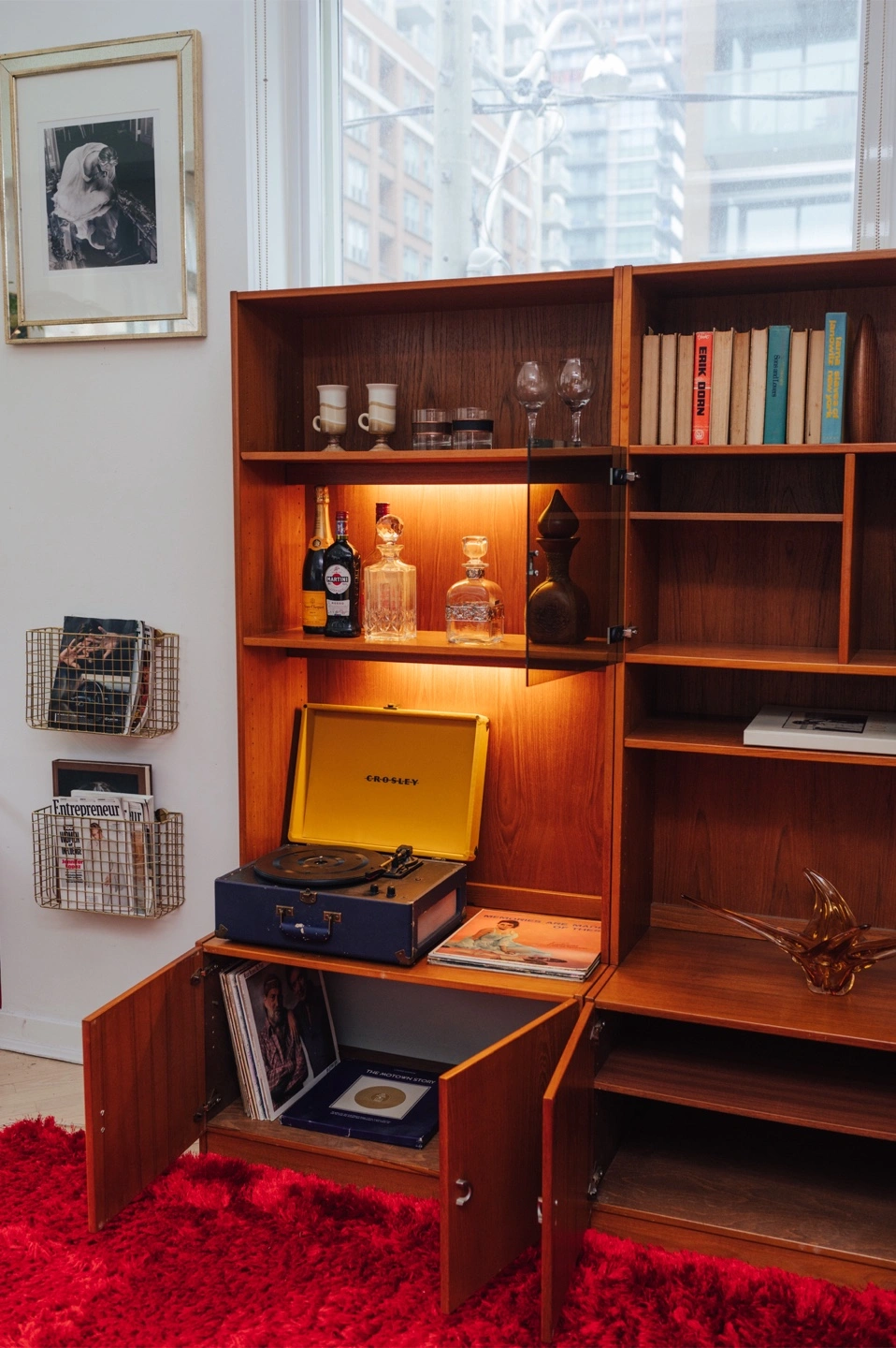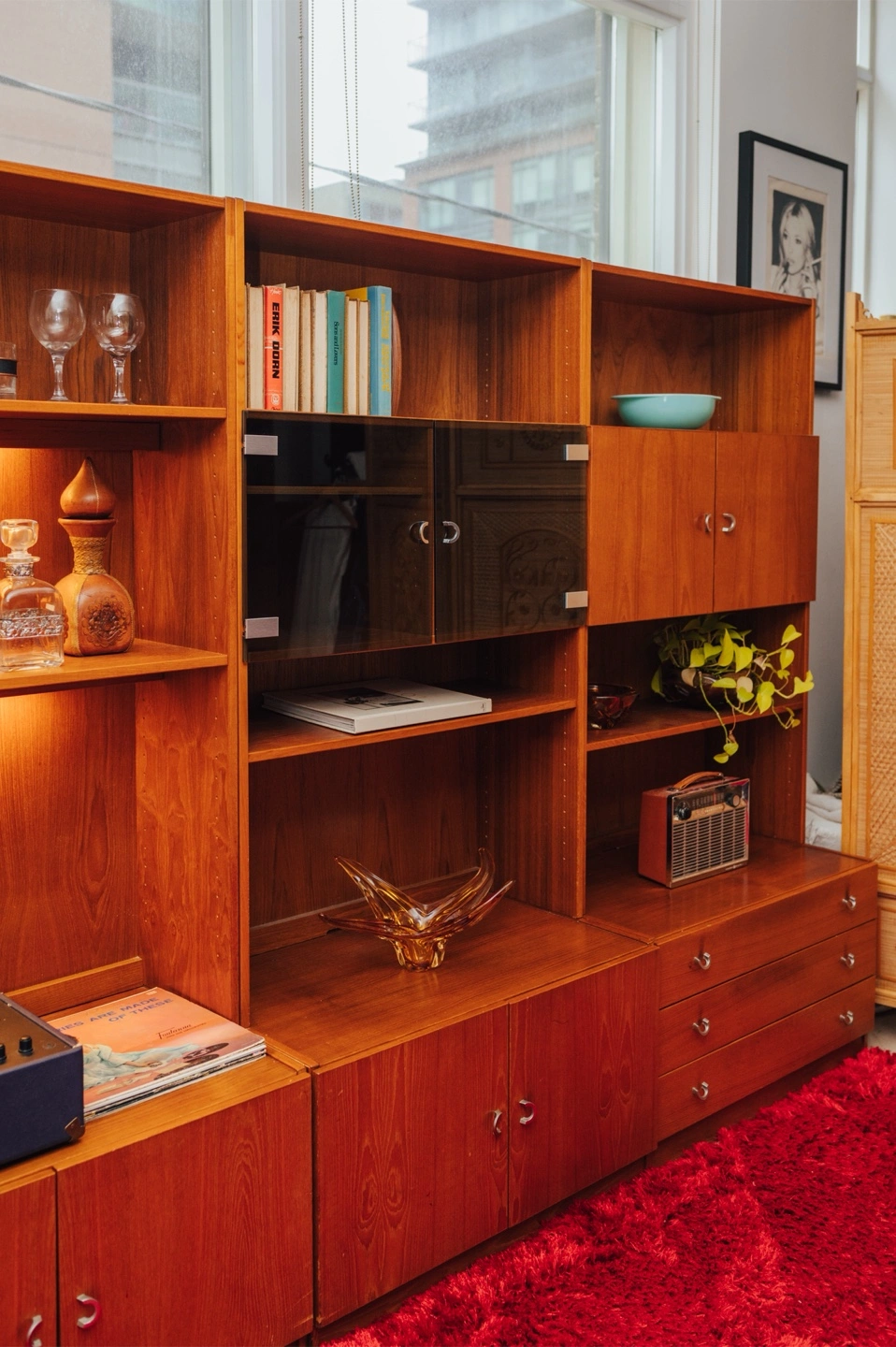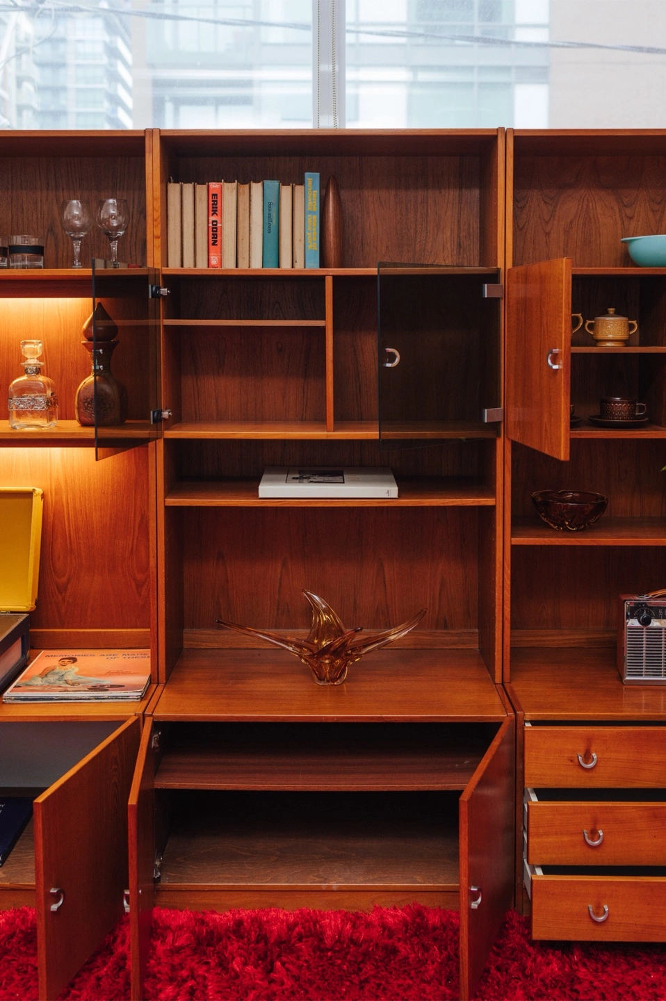 Designed with flexibility in mind, each unit works beautifully on its own β or can be combined to create a striking full-wall storage system. The composition of open shelving, enclosed cabinets, drawers, and smoked sliding doors offers both visual balance and practical storage.