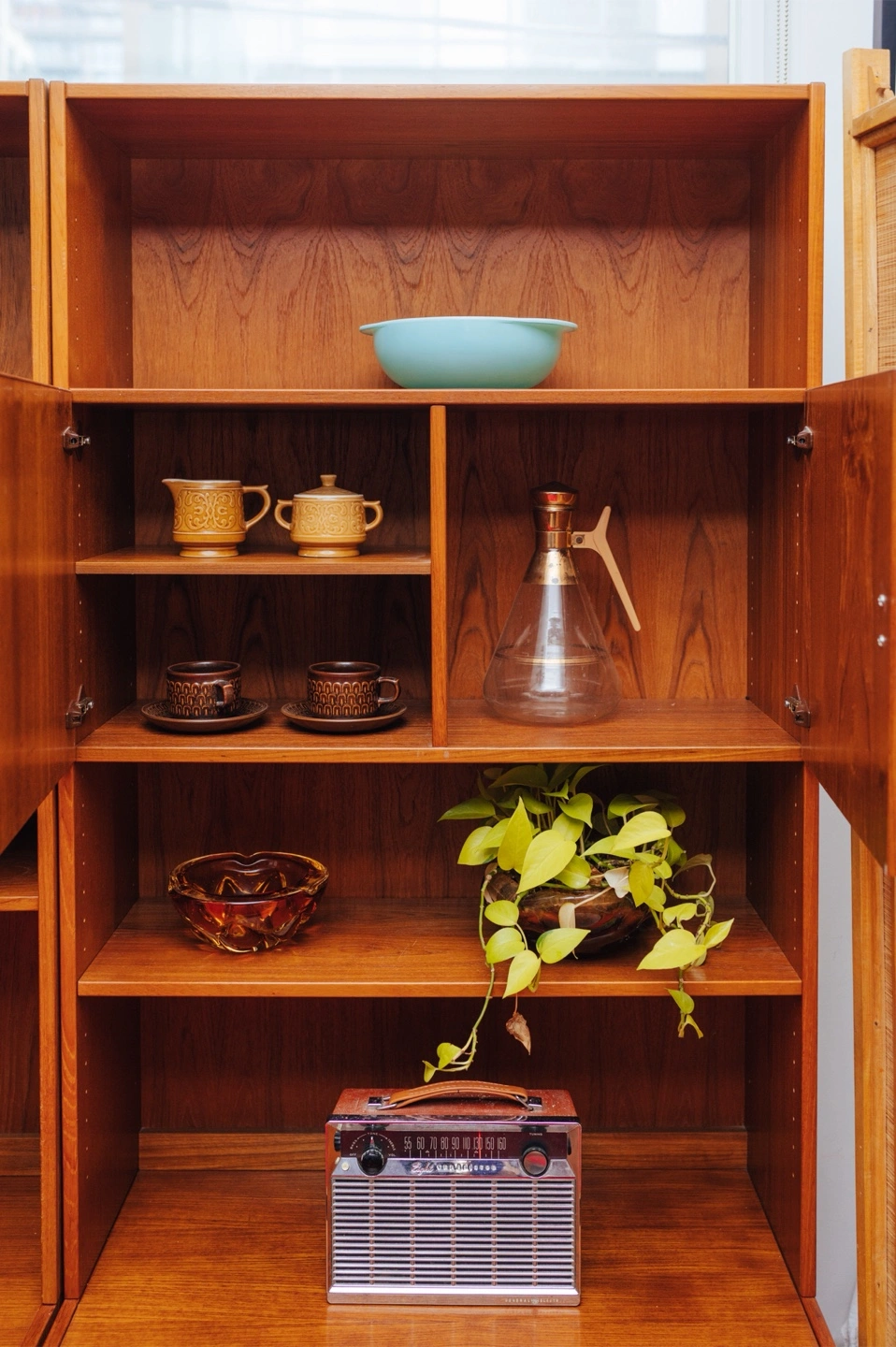 - Open shelving, enclosed cabinets, drawers & smoked sliding doors