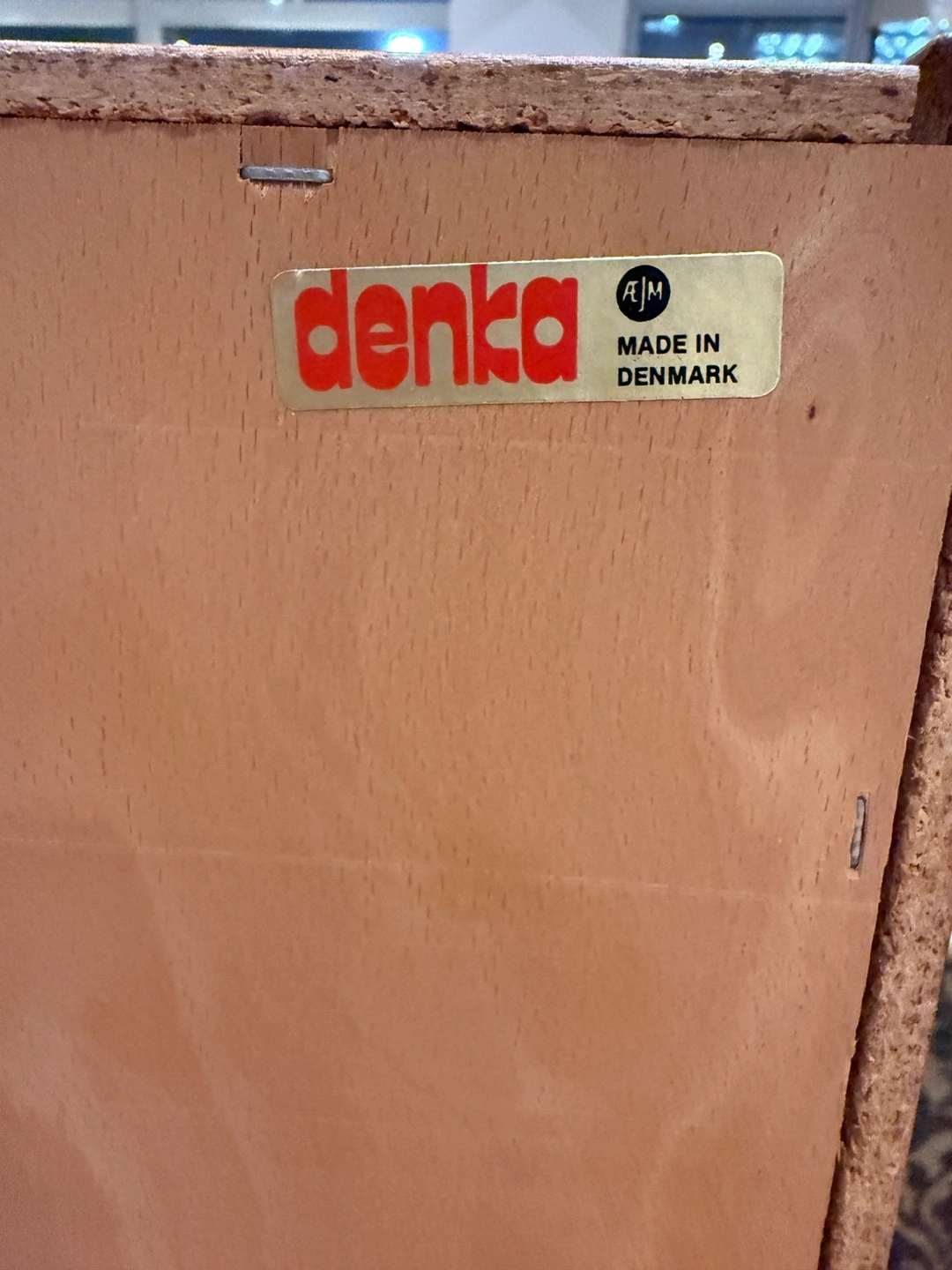 An authentic Danish mid-century modern modular wall unit by Denka, crafted in rich teak and stamped Made in Denmark.