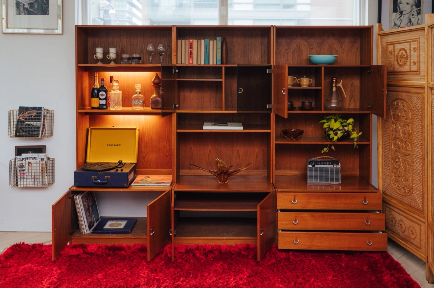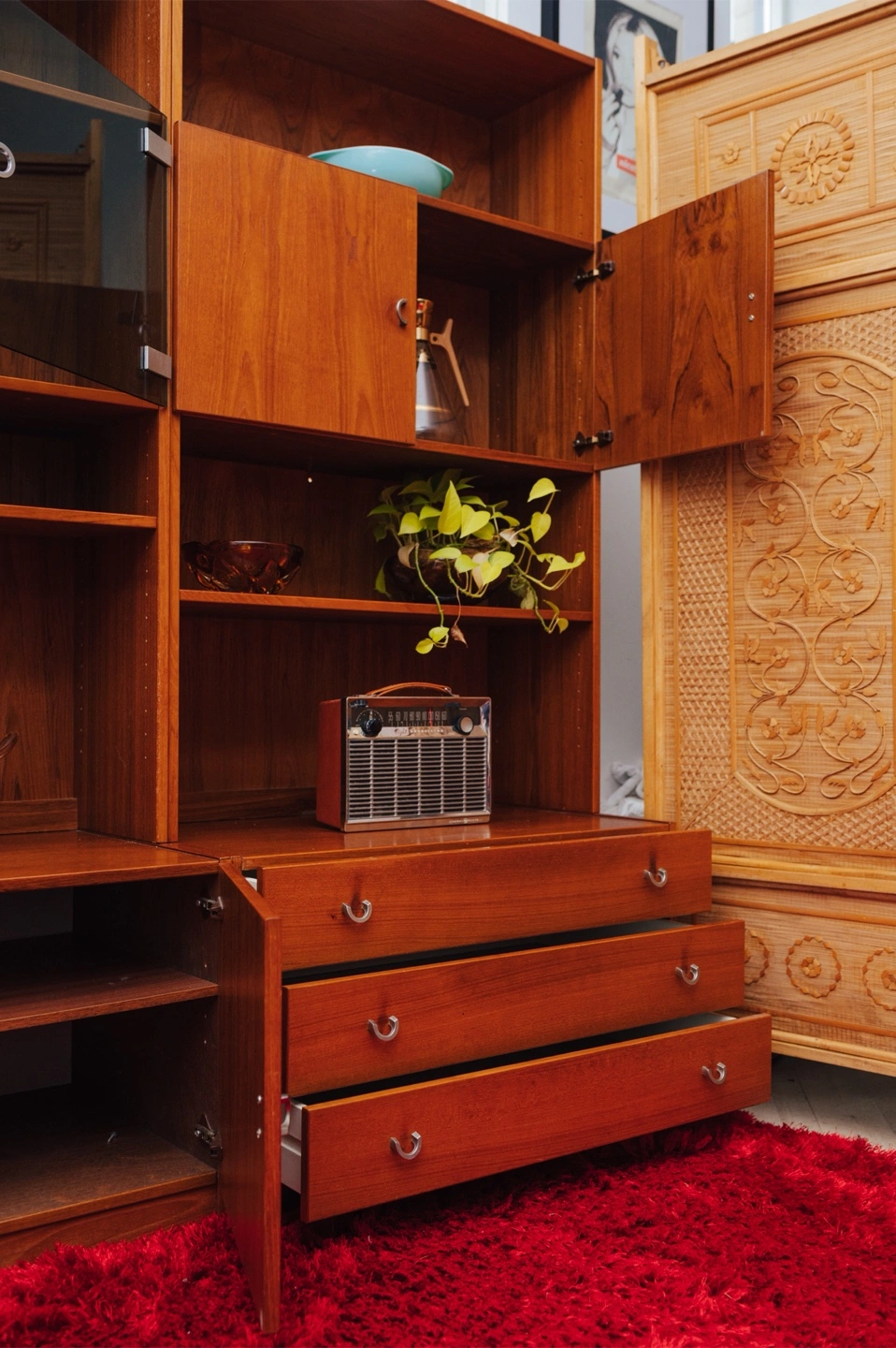 Designed with flexibility in mind, each unit works beautifully on its own β or can be combined to create a striking full-wall storage system. The composition of open shelving, enclosed cabinets, drawers, and smoked sliding doors offers both visual balance and practical storage.