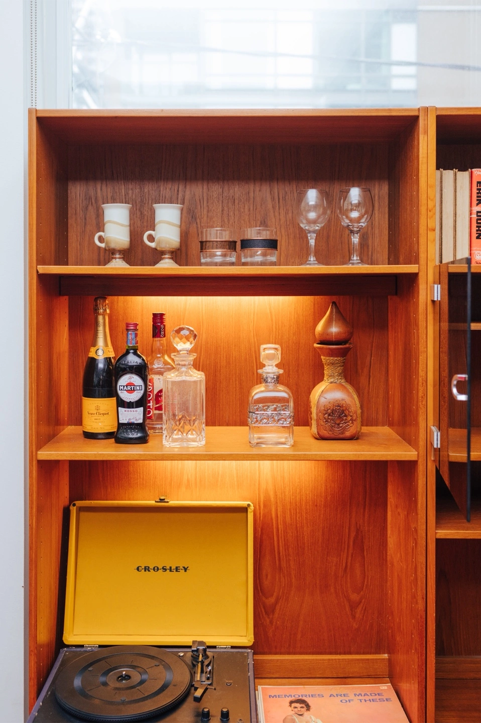 - Open shelving, enclosed cabinets, drawers & smoked sliding doors