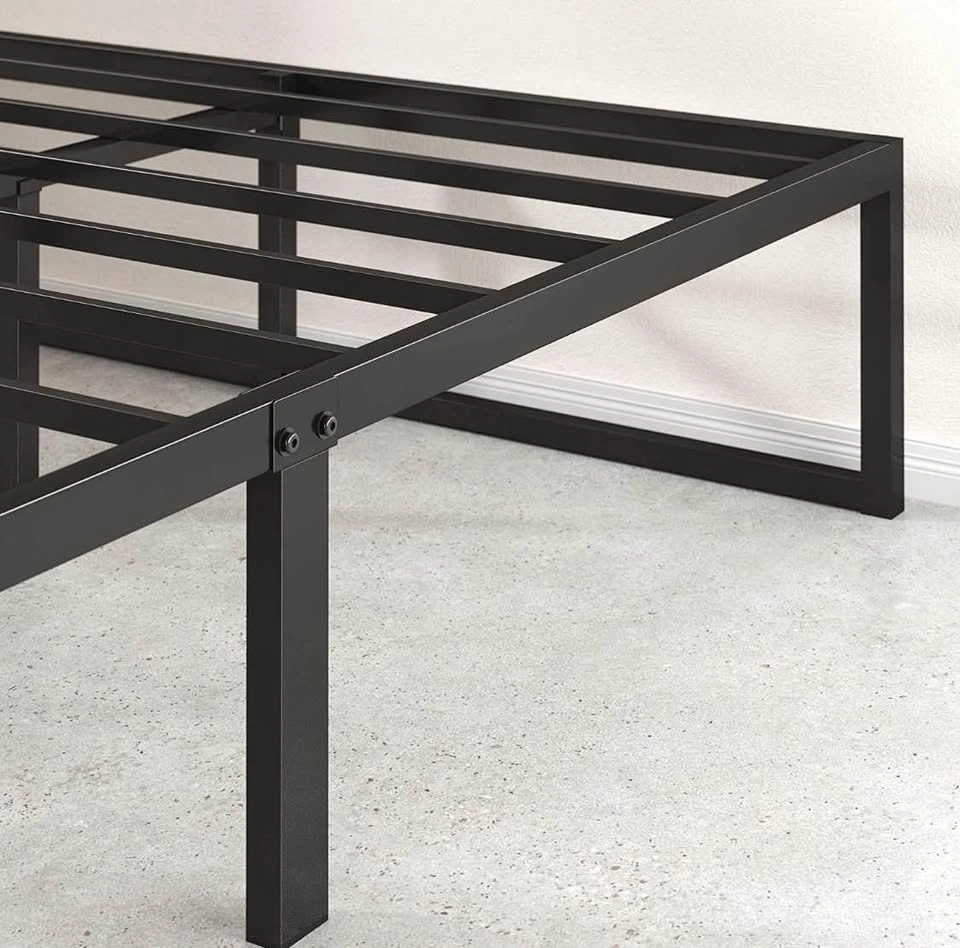 Selling a Zinus Queen Bed Frame, 14-inch height with steel slat support and heavy-duty metal construction. This is a platform bed frame, so no box spring is required.