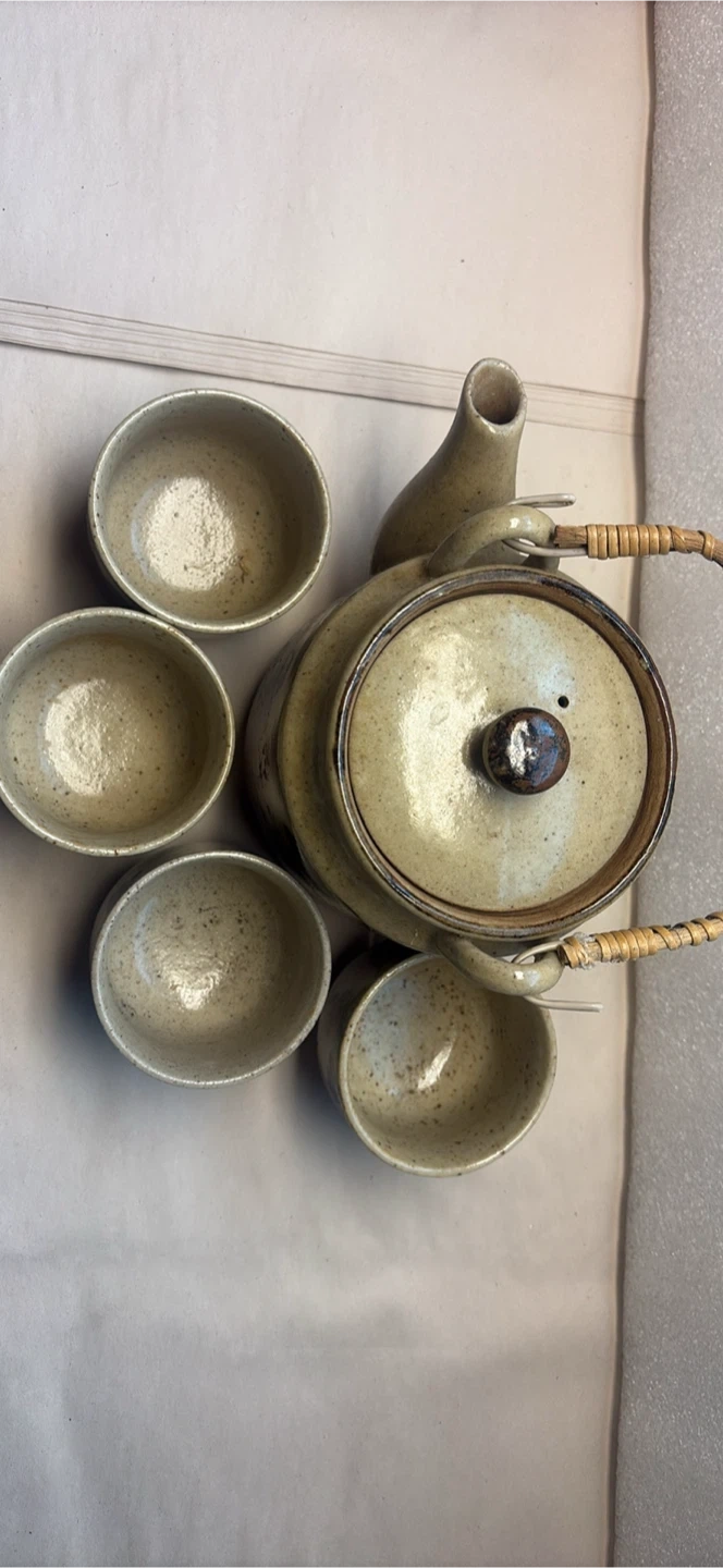 Here's a lovely ceramic tea set that includes a teapot with a wicker handle and four matching cups. The set features a neutral beige colour with a floral design. Perfect for enjoying a relaxing cup of tea with friends or family!