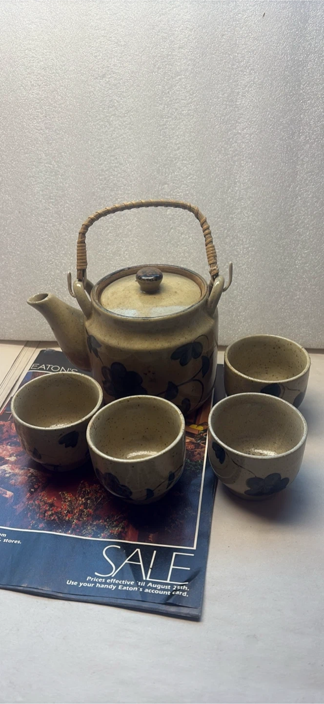 Here's a lovely ceramic tea set that includes a teapot with a wicker handle and four matching cups. The set features a neutral beige colour with a floral design. Perfect for enjoying a relaxing cup of tea with friends or family!
