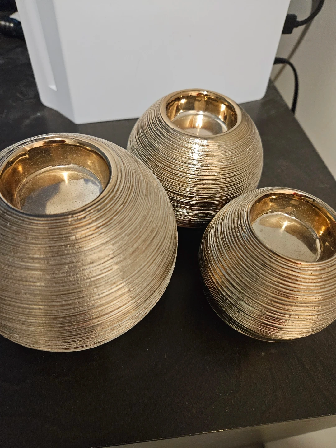 Selling a set of three candle holders in a lovely gold colour. They're in great shape and would look beautiful on a table or shelf. Perfect for adding a touch of warmth to any room!