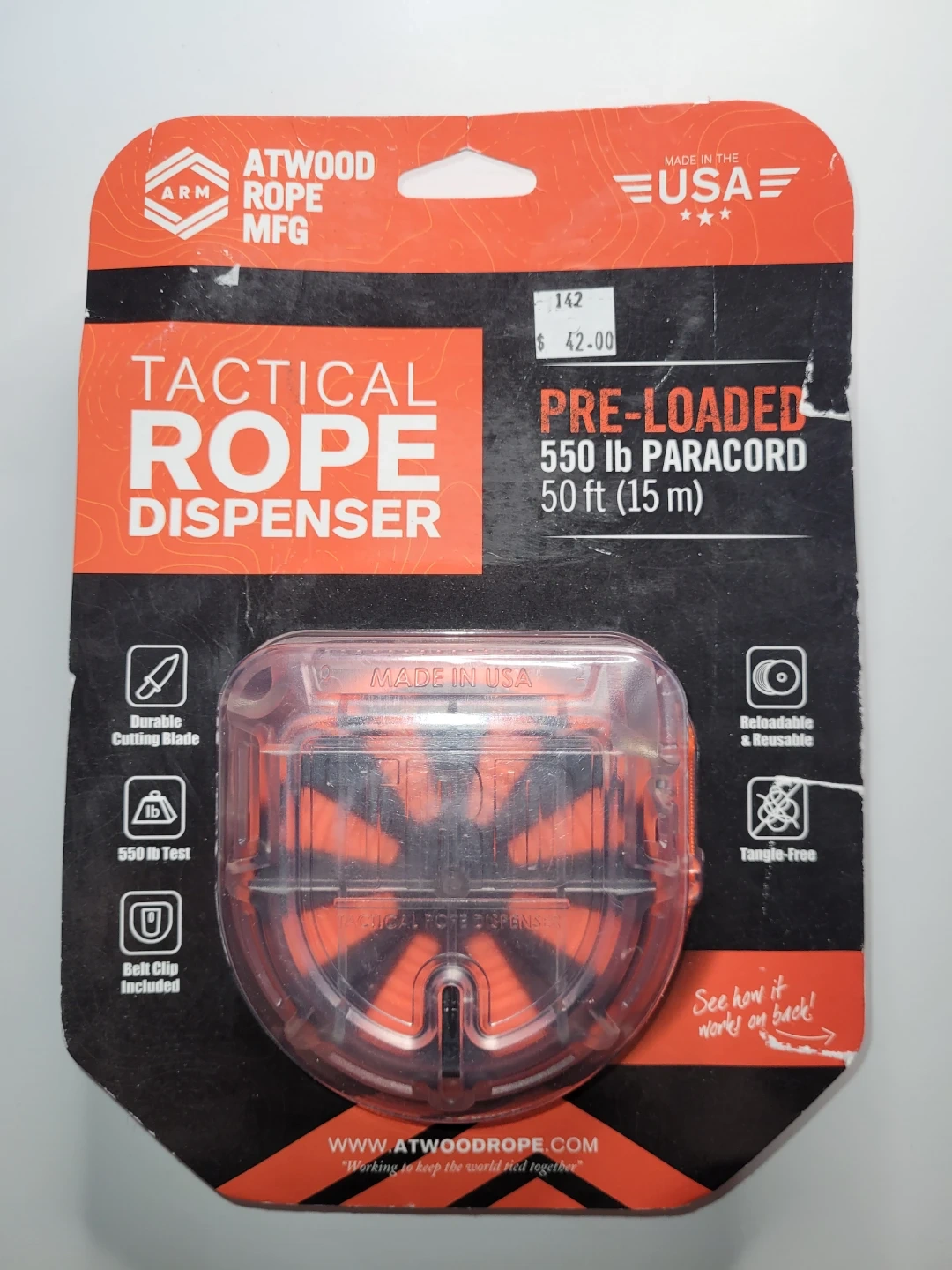 This ARM Tactical Rope Dispenser comes pre-loaded with 50 ft (15 m) of 550 lb paracord. It features a tangle-free delivery system that can be reloaded. It also has a durable cutting blade, a belt clip, and is reusable.