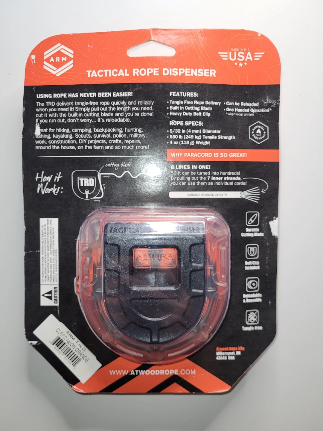 This ARM Tactical Rope Dispenser comes pre-loaded with 50 ft (15 m) of 550 lb paracord. It features a tangle-free delivery system that can be reloaded. It also has a durable cutting blade, a belt clip, and is reusable.