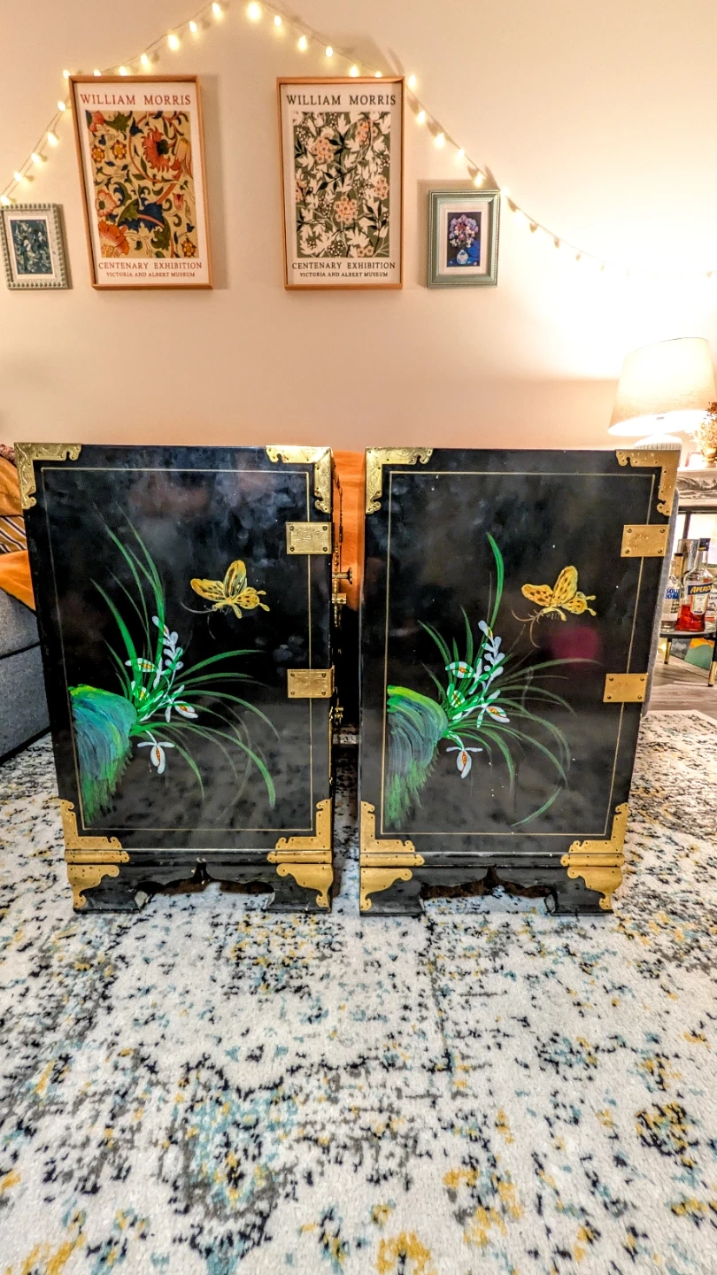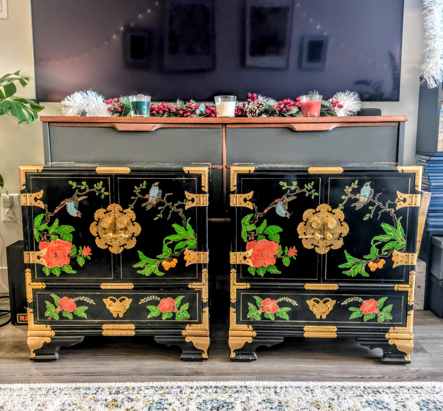 Because these are a matching set, they are ideal for use as statement nightstands, entryway accents, or flanking a fireplace. Their "Chinoiserie" aesthetic fits perfectly into Hollywood Regency, Maximalist, or Modern Eclectic home styles.