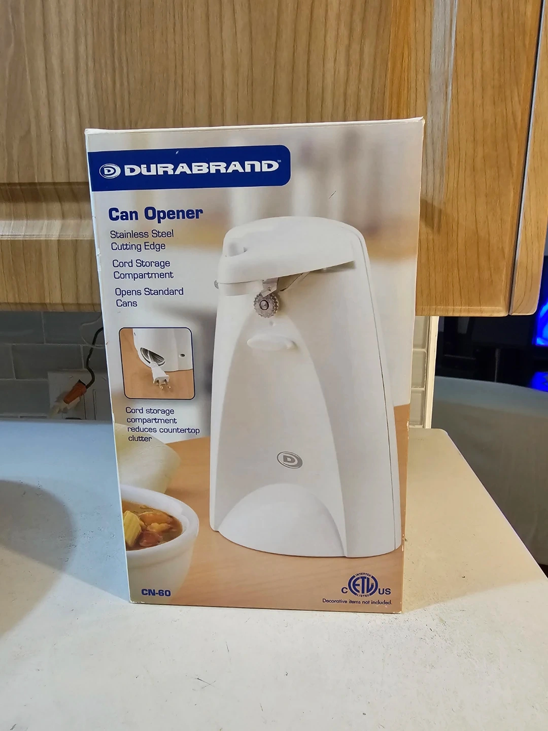 Selling a brand new Durabrand can opener, still in its original box! It features a stainless steel cutting edge that opens standard cans, and a cord storage compartment that reduces countertop clutter. Model number is CN-60