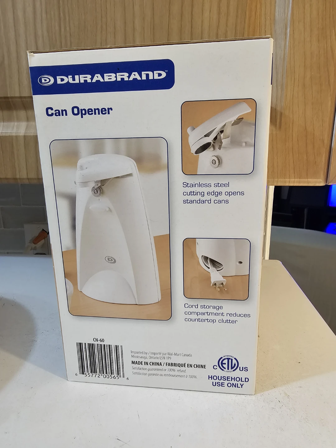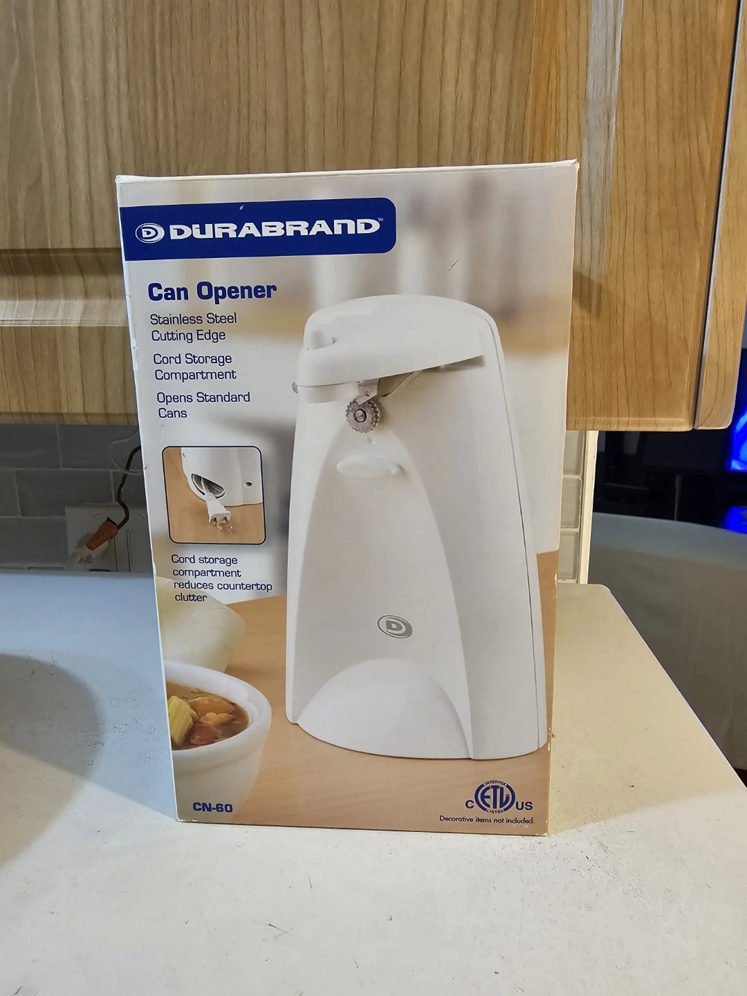 Selling a brand new Durabrand can opener, still in its original box! It features a stainless steel cutting edge that opens standard cans, and a cord storage compartment that reduces countertop clutter. Model number is CN-60