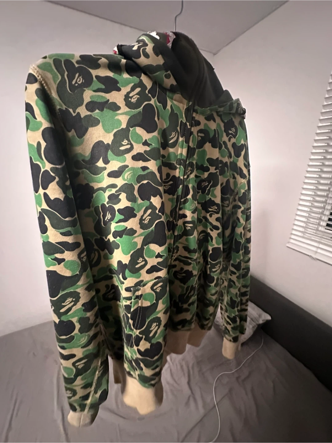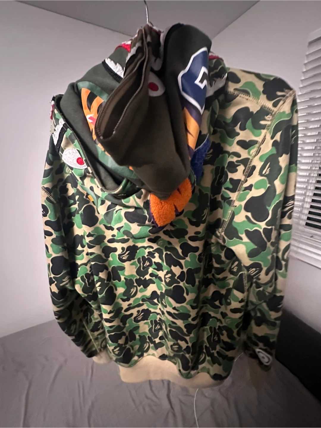 Selling a BAPE camo shark hoodie! It features the iconic shark design with tiger accents. Great for streetwear enthusiasts!